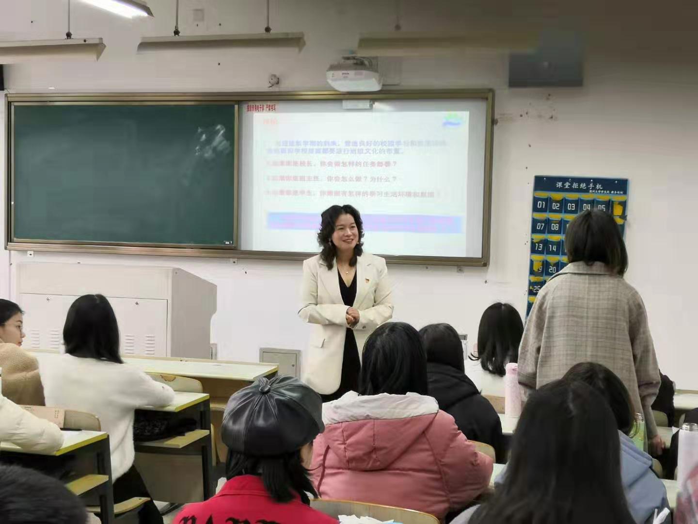 首先,赵瑞霜校长分别从校长、班主任、学生三个角度与同学们探讨如何建设校园文化。她告诉同学们要在其位,谋其职,认真履行相应的职责。而后赵校长介绍了《道法与社会》课程的变化。由于国家对思想政治理论课的重视,学校对于思政教师的需求不断扩大,因此各高校要肩负起培养优秀的思政课教师的重任,而作为思政专业的学生,更要以成为一名优秀的思政课教师为目标不断努力。