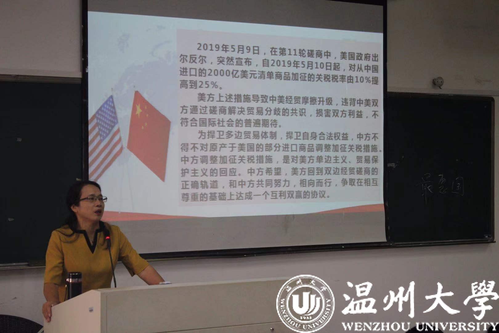 为响应国家号召,让大学生充分了解我国的形势与政策,提升久久热 师生对国际形势与政策的关注度10月21日下午3时30分,久久热 于法政楼203开展了主题为“中美贸易战新 动态”的形势政策课。本次课程由学工办李培芬老师主持,谢建芬老师主讲。