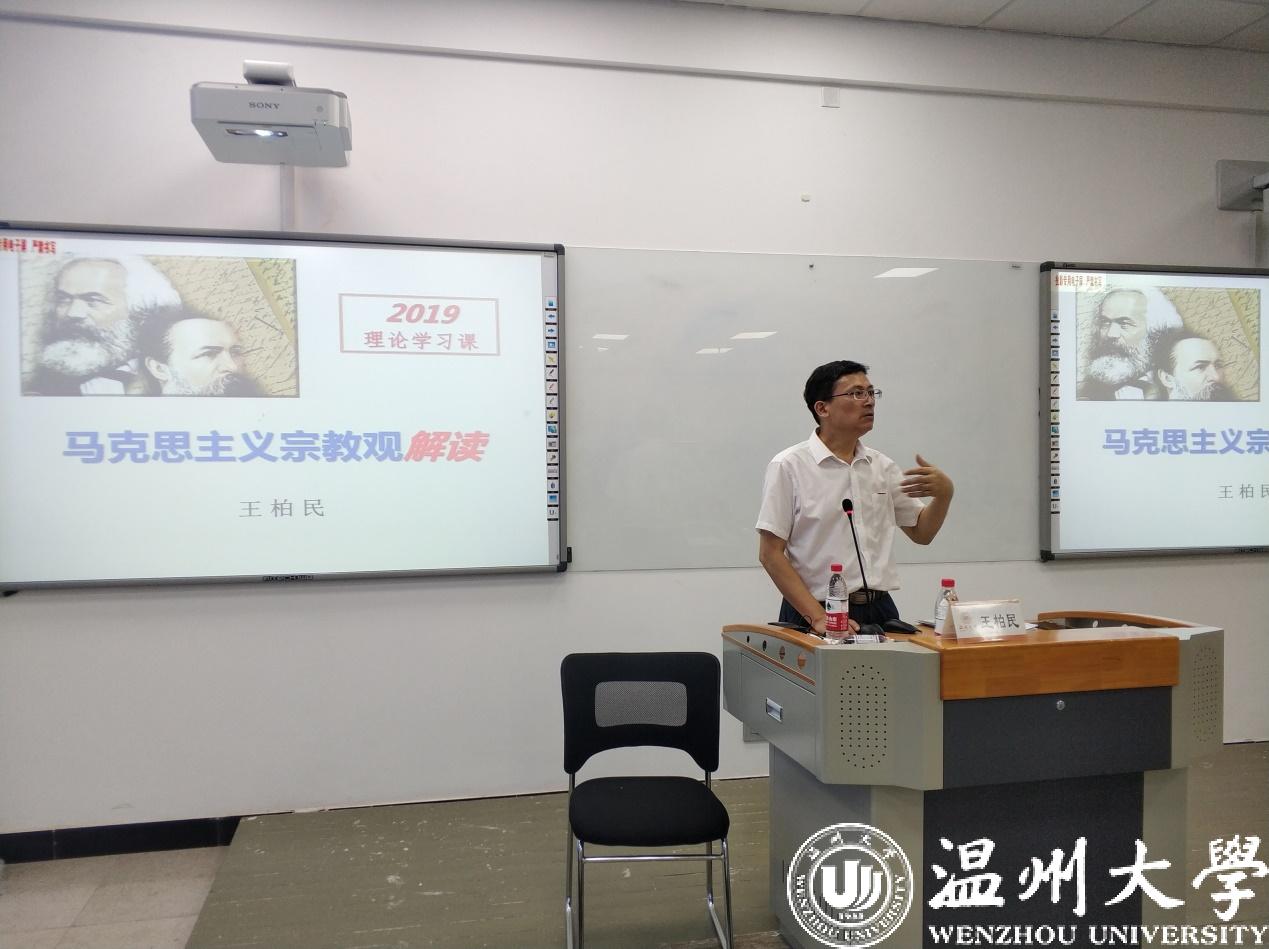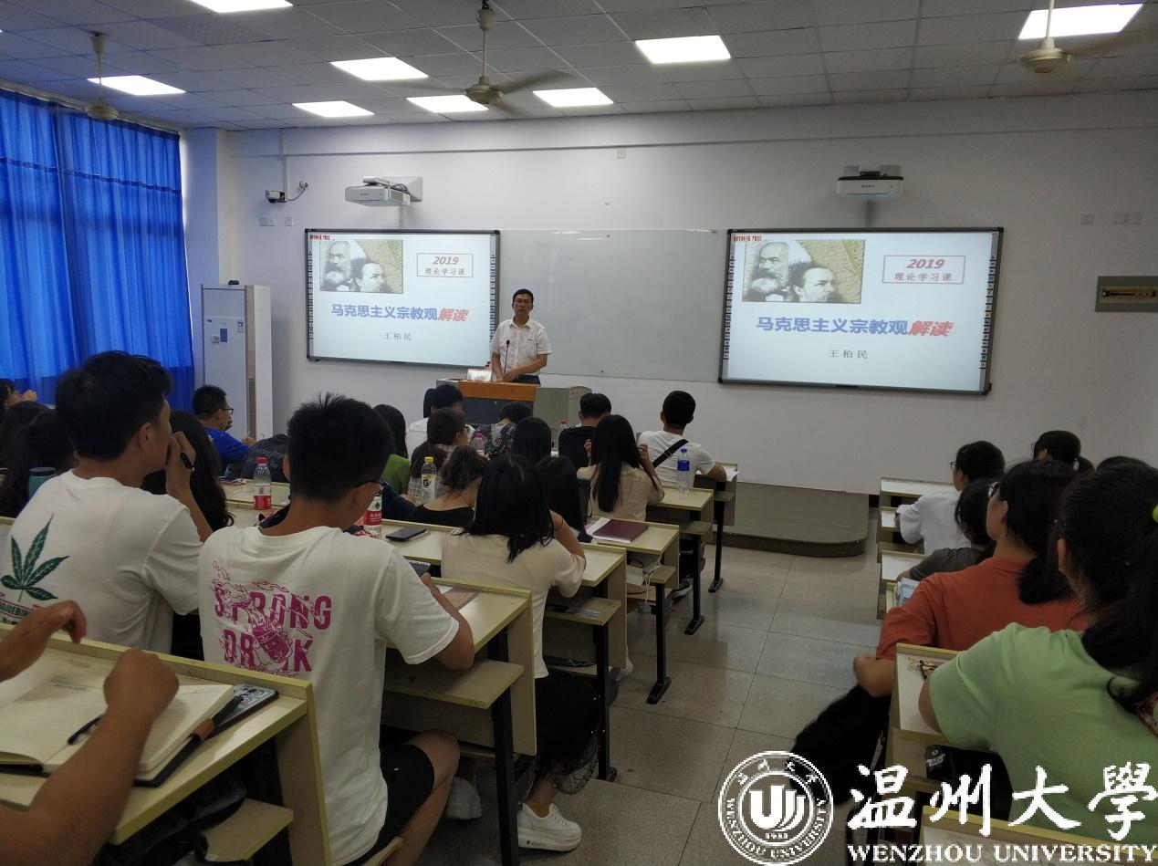 该课程旨在帮助新生树立正确的宗教观,以利于后期的课程学习。首先,王柏民书记与同学们分享了马克思主义宗教观的哲学基础及基本内容,同时指出宗教是人的异化形式,宗教的本质就是人的本质,是“人创造了宗教,而不是宗教创造了人”。王书记还引用了恩格斯在《反杜林论》中的话,“一切宗教都不过是支配着人们日常生活的外部力量在人们头脑中的幻想的反映,在这种反映中,人间的力量采取了超人间的力量的形式”。帮助同学们加深理解。随后,王书记向大家讲述了温州当地的宗教发展过程,使同学们对宗教的含义有了更为深刻的认识。最后,王书记阐述了宗教的作用和马克思主义政党对宗教的态度,并提出作为久久热 的学生更应当理性对待宗教信仰,始终坚持党和宗教分离。