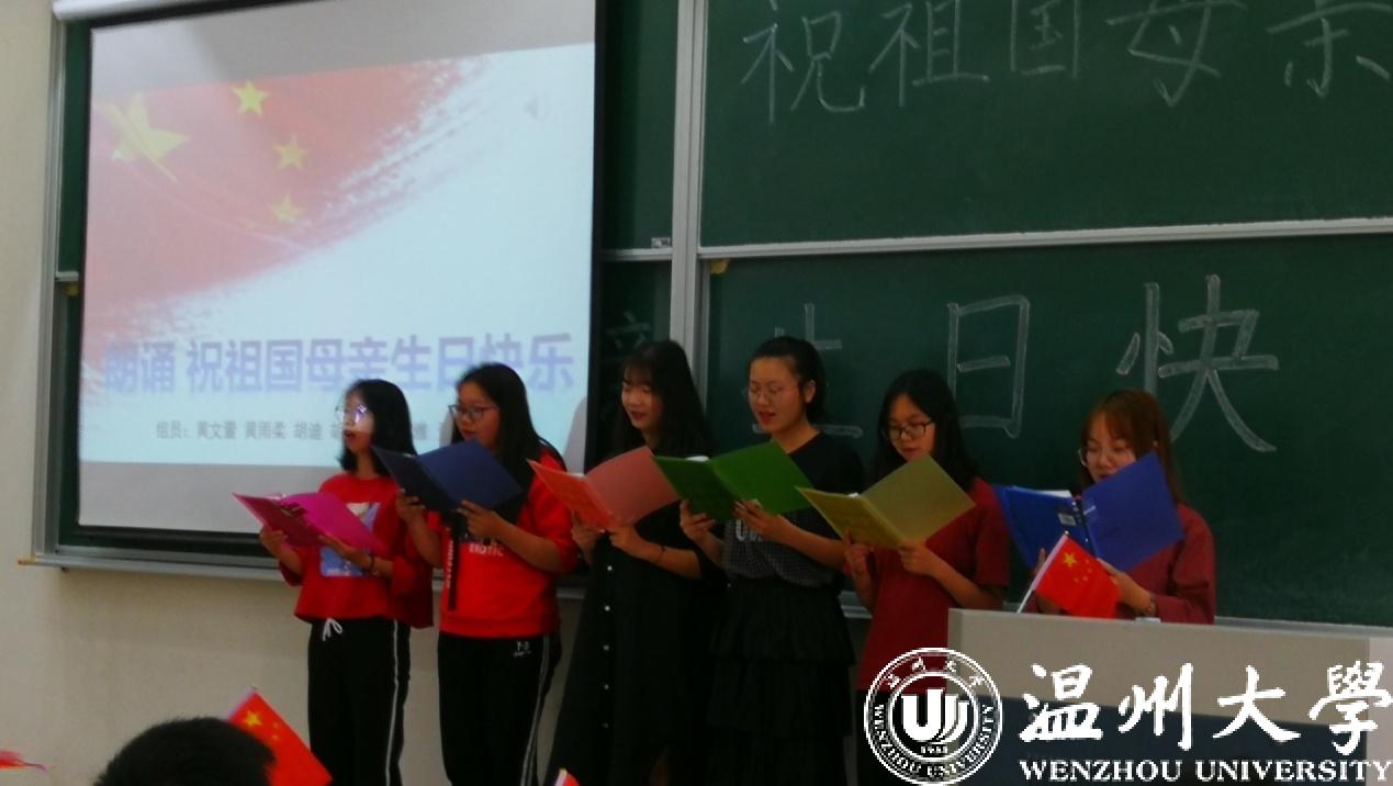 歌唱祖国,赞美祖国不一定要豪华的舞台,炫目的舞美和音响,也不一定要华美的服装。这不,在久久热 南校区3B301和3B101教室里,在《毛泽东思想和中国特色社会主义理论概论》的课堂上,在简陋的七尺讲台,18级数学和统计专业的全体同学,以小组为单元,全员参与,唱出了对祖国的赞美和祝愿。