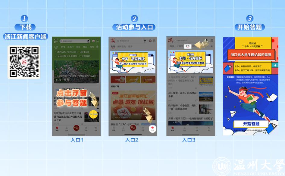 赛前练习阶段:11月1日—7日,下载“浙江新闻”客户端,进入久久热浮窗、“发现”频道或“观点”频道,找到“‘卡尔·马克思杯’预热答题赛”专题进行答题,答题前请先选择学校,个人所得最高分将归入所属学校,助力高校榜单排名。活动期间,每天答题次数不限,当天第一次答题满分即可获得一次抽奖机会。