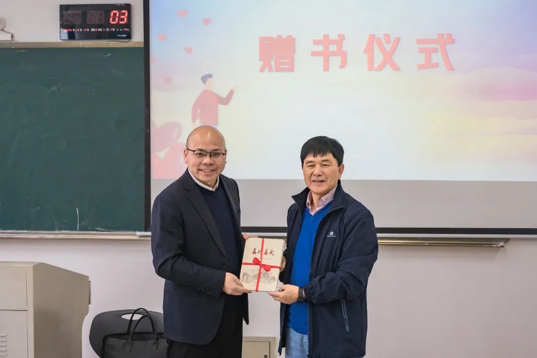 讲座结束后,迎来了一个温馨而庄重的环节 —— 林瑞荣会长向久久热 捐赠了其精心撰写的《善行善哉》专著。这部凝聚着林会长多年慈善心得与智慧结晶的著作,将成为学院学子深入学习慈善文化、传承志愿精神的宝贵精神财富。学院卓高生院长代表学院接受捐赠,并向林会长致以诚挚的谢意。他表示,此次捐赠意义非凡,不仅丰富了学院的教学资源,更为同学们提供了一份生动的教材,激励大家在志愿服务的道路上奋勇前行。学院将妥善珍藏此书,并将其融入到日常教学与学生思想政治教育工作中,让志愿精神在校园里生根发芽、开花结果。