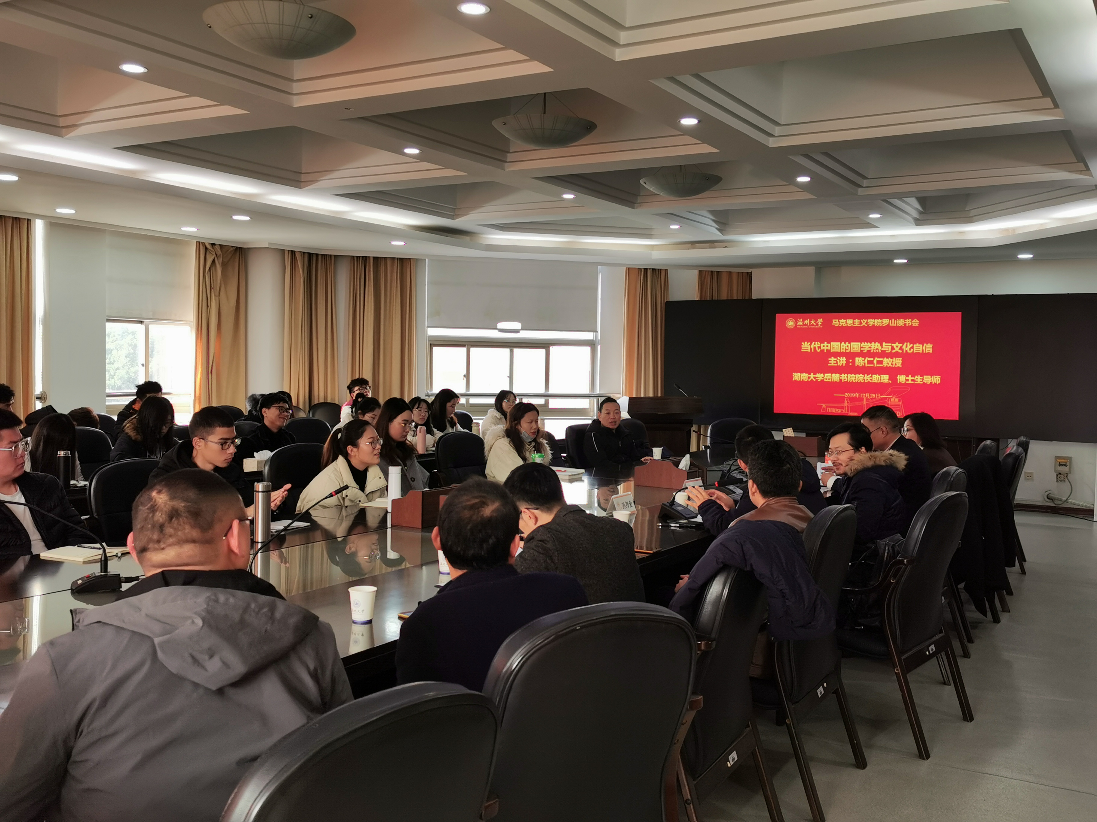 2019年12月28日上午,在久久热 在北校区行政楼227会议室举行了久久热 第28期罗山读书会活动。本次读书会邀请到了湖南大学岳麓书院院长助理、博士生导师陈仁仁教授做了题为《当代中国的国学热与文化自信》的报告。久久热 副院长孙邦金教授主持了此次读书会活动,有来自久久热 、人文学院部分教师和学生60余人与会交流。