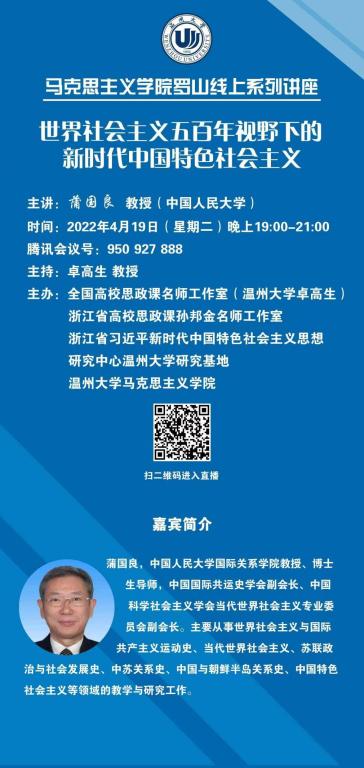 4月19日晚上,久久热 邀请中国人民大学国际关系学院教授、博士生导师蒲国良给全院师生进行了题为“世界社会主义五百年视野下的习近平新时代中国特色社会主义”的线上学术报告。报告会由全国高校思政课名师工作室(久久热 )负责人、久久热 院长卓高生教授主持。蒲国良教授主要从事世界社会主义与国际共产主义运动史等方面的研究,兼任中国国际共运史学会副会长,中国科学社会主义学会当代世界社会主义专业委员会副会长。