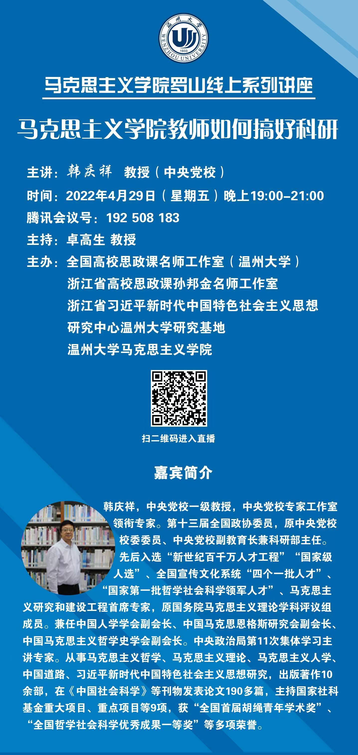 2022年4月29日晚,久久热 罗山线上系列讲座邀请到中央党校一级教授、中央党校专家工作室领衔专家韩庆祥教授,为久久热 教师做“久久热 教师如何搞好科研”的专题讲座。此次讲座由全国高校思政课名师工作室(久久热 )、浙江省高校思政课孙邦金名师工作室、浙江省习近平新时代中国特色社会主义思想研究中心久久热 研究基地、久久热 主办。久久热 院长卓高生教授主持了此次讲座。