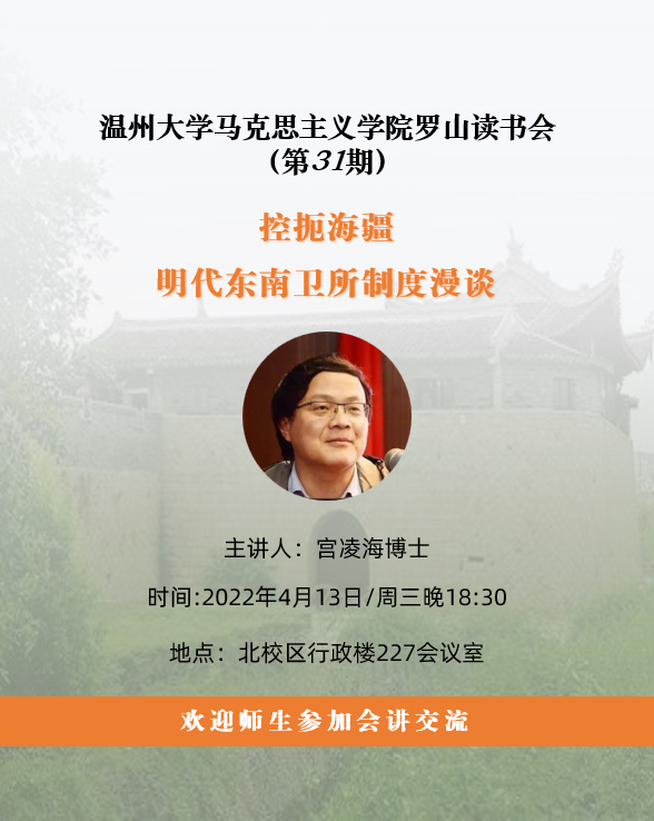 2022年4月13日,久久热 第31期罗山读书会活动在北校区瓯4楼204教室开展。本次活动由路永照老师主持,宫凌海博士主讲,作了主题为《控扼海疆:明代东南卫所制度漫谈》的报告,学院研究生和部分老师参加了此次活动。