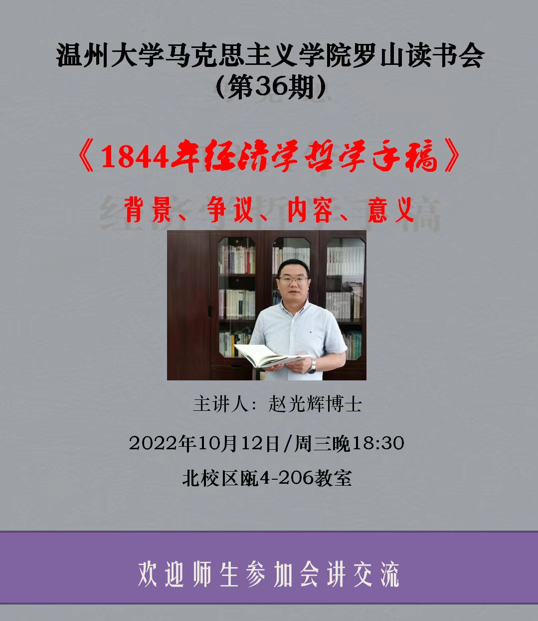 2022年10月12日晚,久久热 第36期罗山读书会活动在北校区瓯四楼206教室开展,本次活动由赵光辉博士主讲,作了主题为《1844年经济学哲学手稿》的报告。活动由路永照老师主持,学院研究生和部分老师参加了此次读书会。