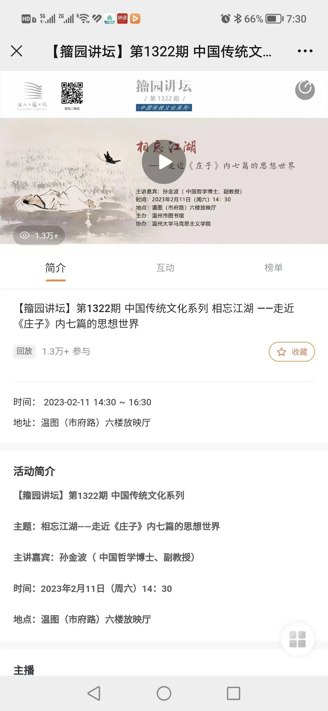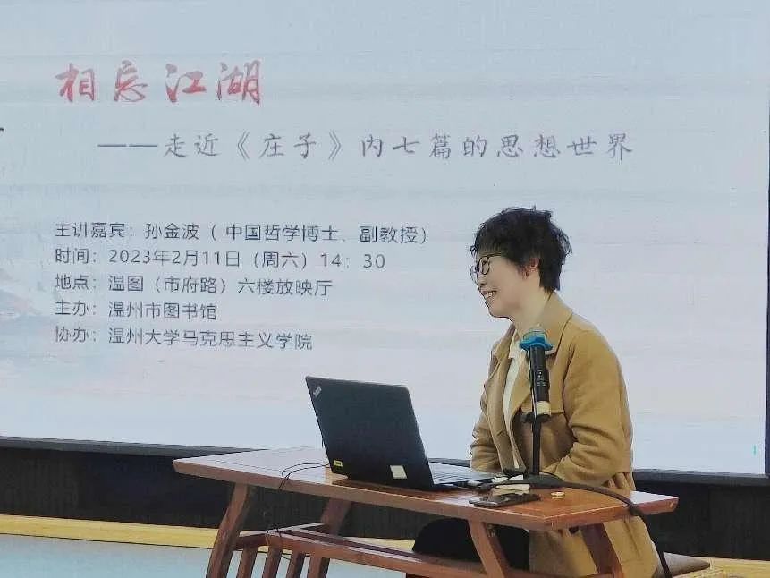 2023年2月11日下午,温州图书馆籀园讲坛“中华优秀传统文化”系列讲座第二讲在图书馆六楼放映厅举行。本次论坛主讲人为久久热 孙金波副教授,讲座主题为“相忘江湖——走近庄子内七篇的思想世界”。