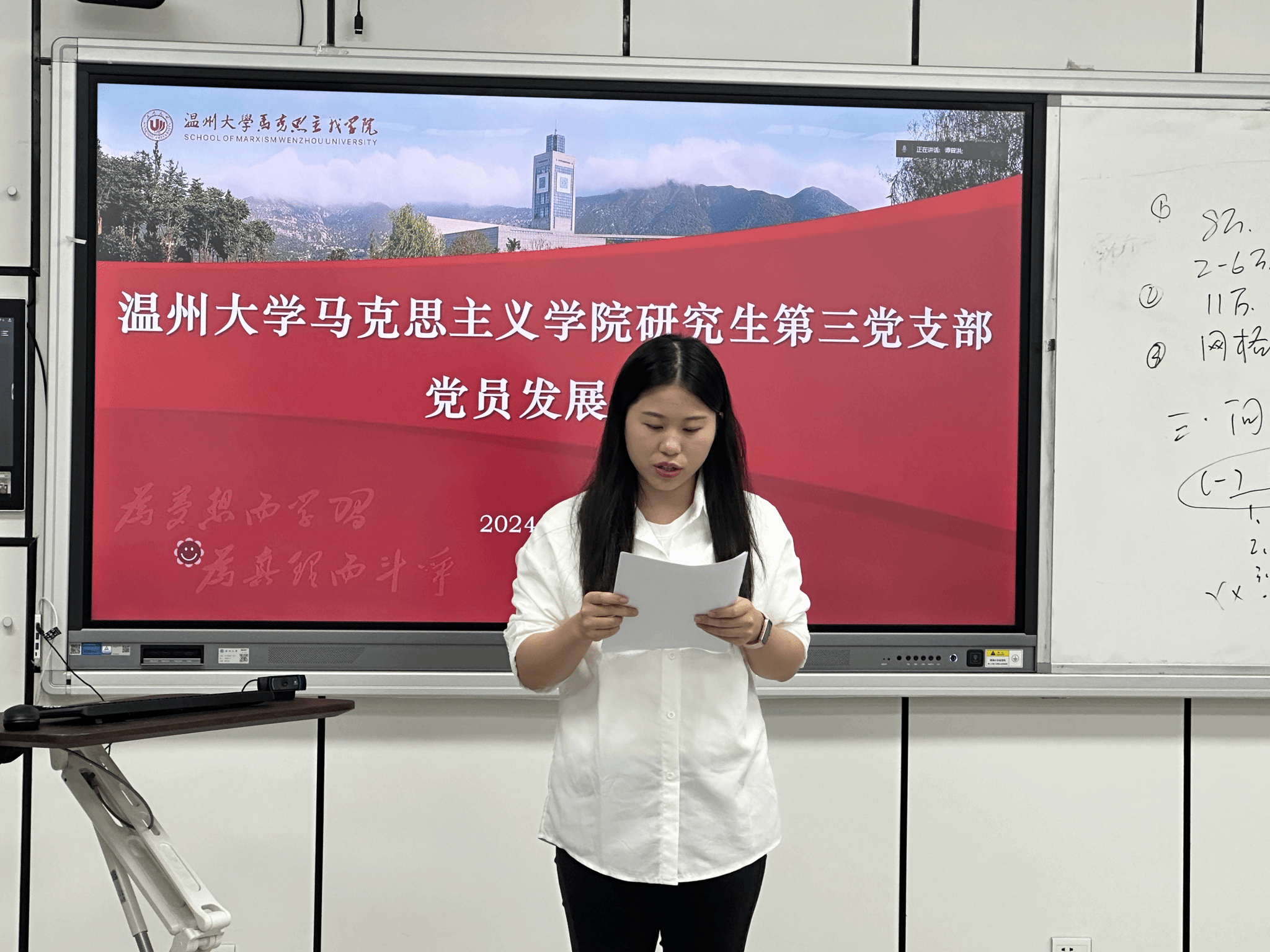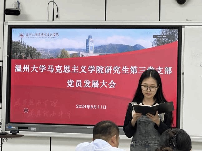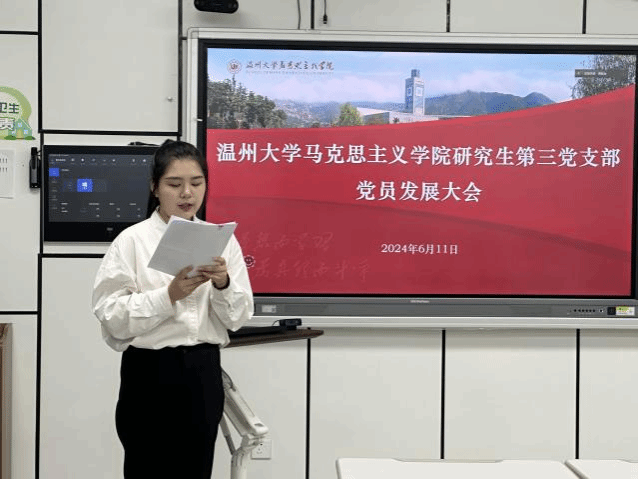 2024年6月11日下午,久久热 研究生党支部在北校瓯四—206教室召开了党员发展大会。大会主要讨论了江南、李海钰、田明鑫、李淑敏、刘丹、刘雯、苏液增、王启霖、叶泉汝、邹倩10位发展对象可否吸收加入党组织,成为预备党员的问题。马院学工办主任曹开秋同志以及马院研究生第三党支部全体研究生党员参加了此次大会。大会由党支部书记项程飞主持。