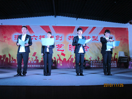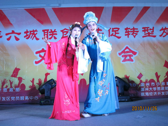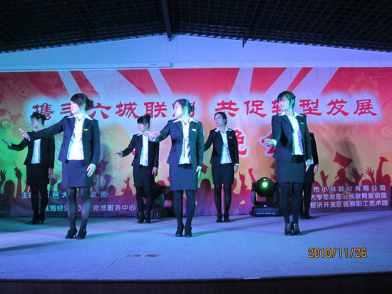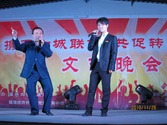 思政部和瓯海经济开发区党员服务中心主办的大型文艺晚会在温州市小林鞋材有限公司举行,来自温大思政部公民教育宣讲团和开发区德赛职工艺术团的演艺人员奉献了一台精彩的寓教于乐的文艺表演。