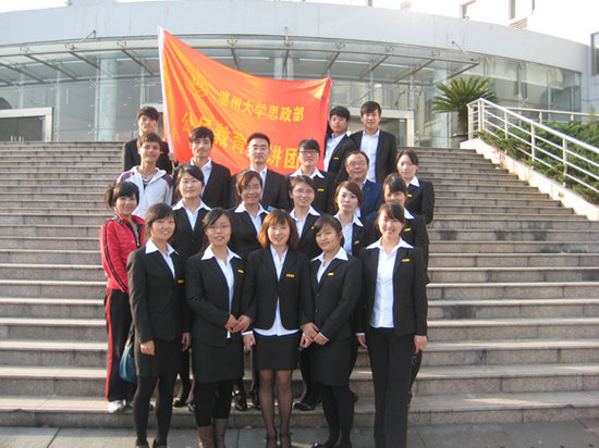 由思政部教工党支部和研究生党支部组织发起的本次活动,从策划、组织、准备和演出历时一个多月。作为思政部党总支创先争优的一项活动,本次公益演出是公民教育宣讲团走进企业、社区和农村的第一站,是高校师生围绕温州社会经济发展的中心工作而服务地方的重要举措。宣讲团将通过形势与政策的讲解、文明倡议书的发放、主题文艺演出、社区志愿服务、调查研究等形式多样的方式,旨在提升温州市民的文明素养,同时为广大研究生能力提升创设实践锻炼的平台。