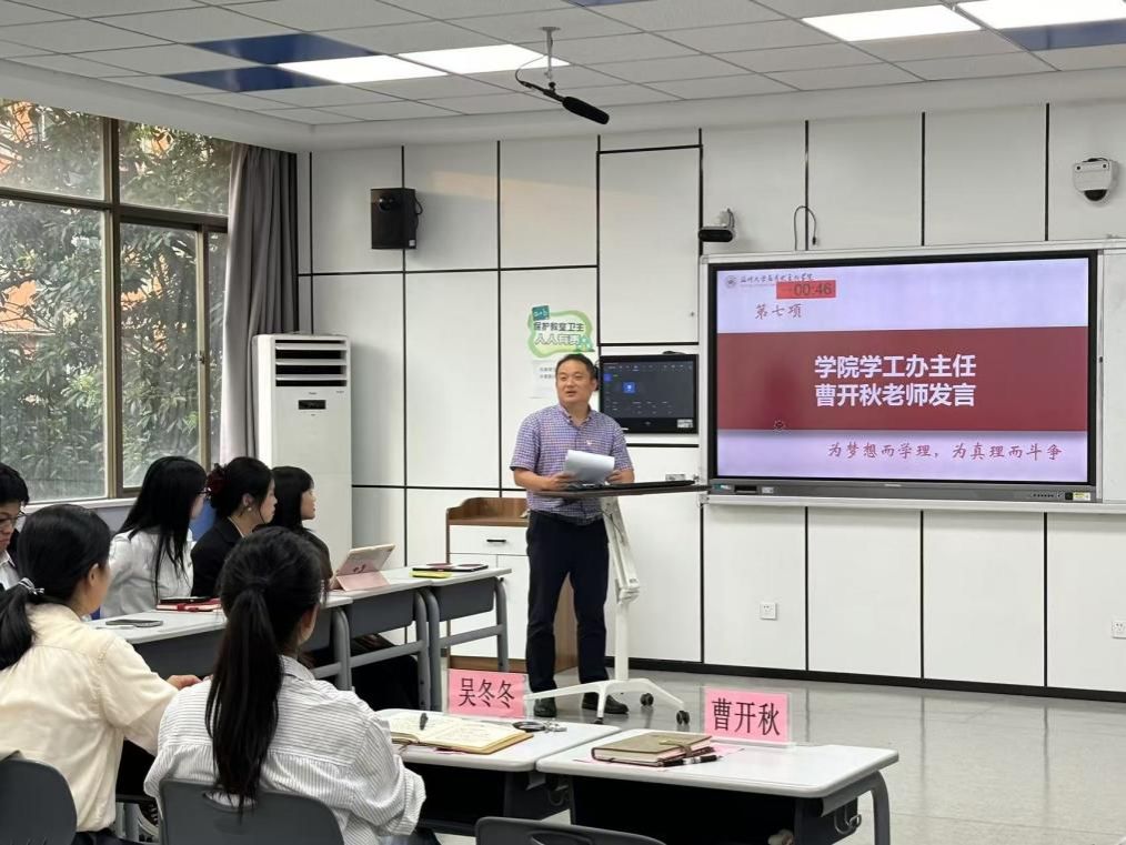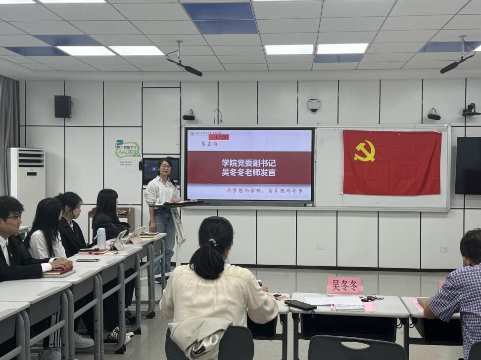 最后,学工办主任曹开秋老师明确党支部的主导地位和引领作用,肯定久久热 研究生第二党支部党员们的个人经历,希望党员同志们不负众望,加强学习,以身作则。学院党委副书记吴冬冬老师强调党支部是党的基础组织,提出党支部建设要对标“七个有力”,即党员工作的教育、管理、监督要有力和师生工作的组织、宣传、凝聚、服务要有力,并感谢上一届支委的辛苦付出,鼓励新一届支委多向上一届支委学习党务工作,着力发挥好党员先锋模范作用,充分发挥党组织的政治核心和战斗堡垒作用,以旗帜示范引领全体学生,携手共建更加优秀、更具特色、更有活力的党支部。
