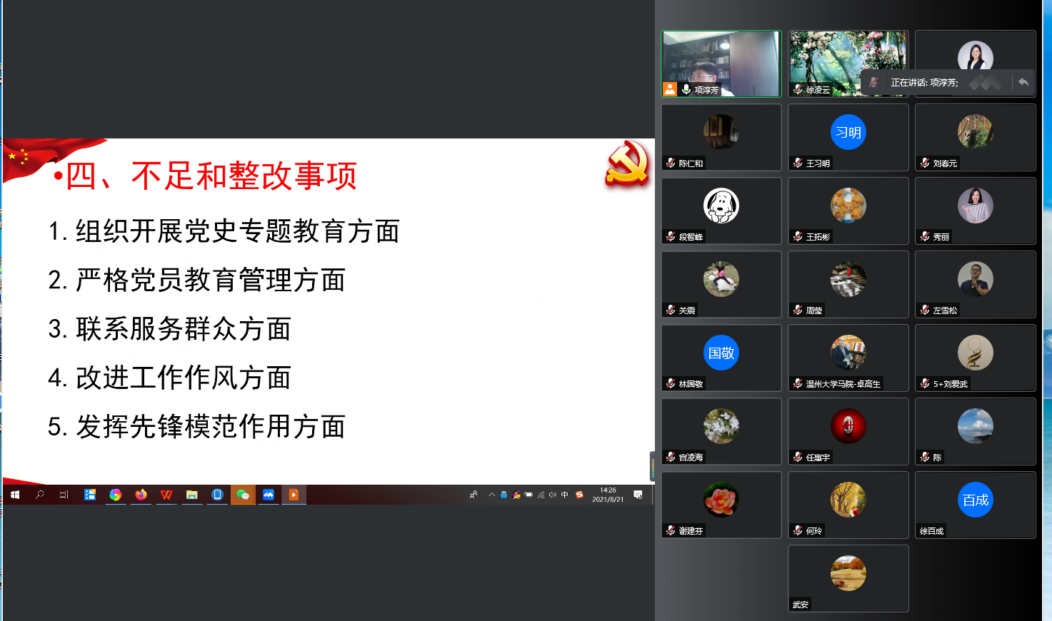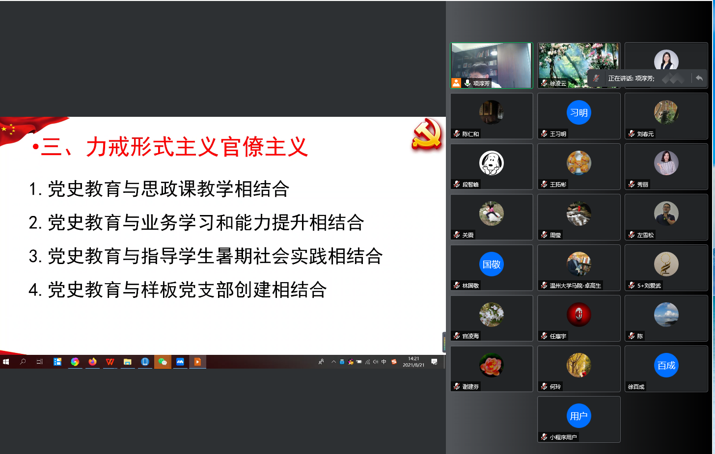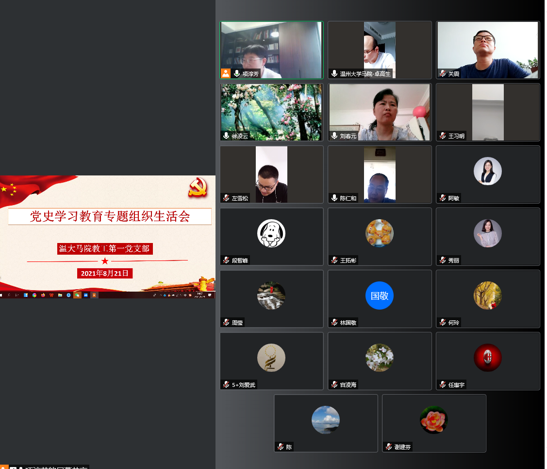 为贯彻落实市、校党史学习教育领导小组办公室部署和学院关于召开党史学习教育专题组织生活会方案的精神,8月21日下午,久久热 教工第一党支部围绕“学党史、悟思想、办实事、开新局”的主题,组织全体党员通过腾讯会议召开线上党史教育专题组织生活会。会议由党支部书记项淳芳同志主持,学院院长兼党委副书记卓高生同志以普通党员身份参加党支部和概论党小组的专题组织生活会。