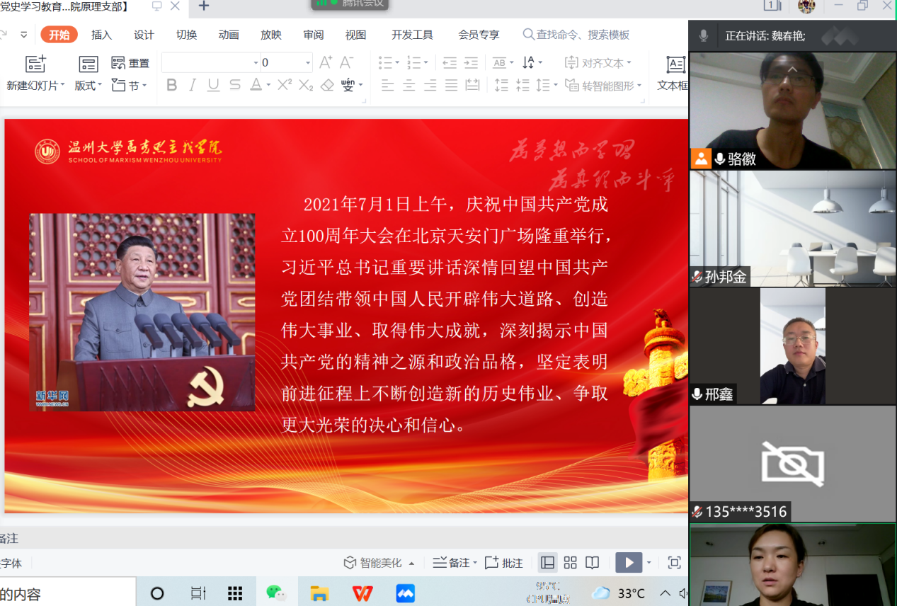 根据市和学校党史学习教育领导小组办公室部署要求,围绕“学党史、悟思想、办实事、开新局”为主题,认真贯彻“学史明理、学史增信、学史崇德、学习力行”要求,久久热 原理党支部在8月28日下午,以腾讯会议方式在线上召开了专题组织生活会,交流学习体会,查找差距不足,引导广大党员不断增强“四个意识”、坚定“四个自信”、做到“两个维护”。
