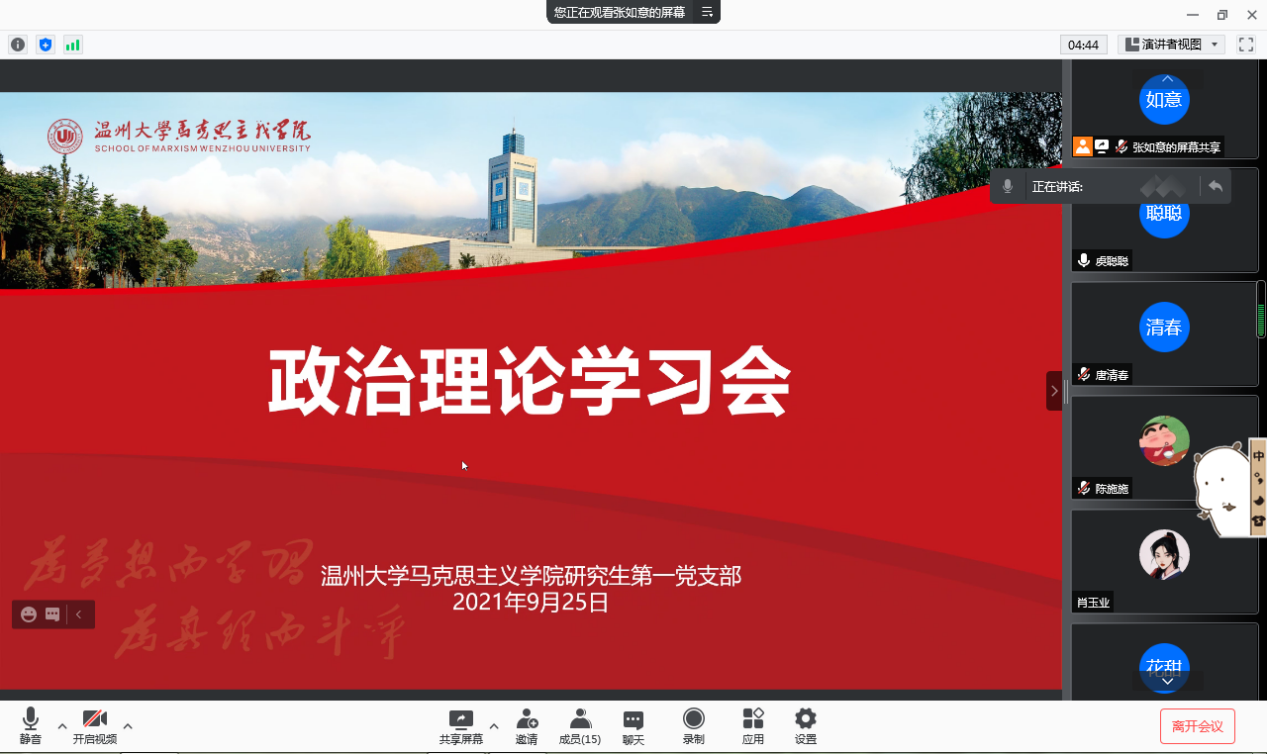 9月25日晚,久久热 研究生第一党支部于线上召开政治理论学习会,全体党员参与会议,会议由党支部副书记张如意主持。