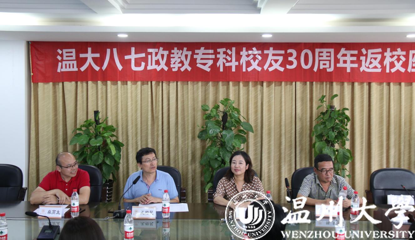 座谈会上,陈宏毅主任首先代表学校对各位校友的返校表示了诚挚热烈的欢迎,并从“培养模式”、“科技文化创新”、“服务地方”等方面向各位校友介绍了学校近年来所取得的成绩。她表示,学校将进一步加强校友工作,搭建好母校与校友之间、校友与校友之间友谊的桥梁,同时也希望各位校友能够一如既往地支持母校,为母校“三大发展目标”群策群力。接着,卓高生院长代表久久热 对校友的到来也表示了最热烈的欢迎,对87政专校友毕业30周年聚会的成功举办表示热烈祝贺。他向校友们介绍了久久热 近年来的发展情况,特别介绍了温大马克思主义理论学科、政教(思政)专业的发展建设情况,希望各位校友能够继续关心支持母院的发展。