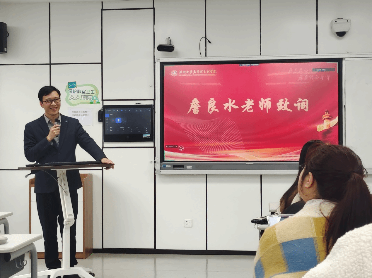 詹良水老师作为指导师代表进行发言。詹老师借用“学而时习之,不亦说乎。”“是故学然后知不足,教然后知困。知不足,然后能自反也;知困,然后能自强也。” “得天下英才而教育之,三乐也。”表达了对同学们的殷殷嘱托。詹老师希望同学们认真对待实习,仔细研读教材,并直面批评,做到“知困”,并做到“自强”、“自反”。