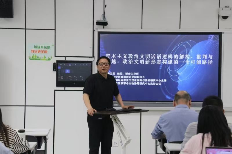 陈宝胜老师从马克思主义学科如何进行科学研究角度,就“资本主义政治文明话语逻辑的解构、批判与超越:政治文明新形态构建的一个可能路径”这一主题进行了深入系统的讲解。陈宝胜教授从中国式现代化建设需要的角度入手,指出解构资本主义政治文明话语逻辑的价值所在,进而探究人类文明新形态何以可能及未来道路。陈教授认为,社会契约、民主选举、分权制衡、民主法治的“契约型”话语是资本主义政治文明叙事中的核心构成,其中存在明显的逻辑缺陷与断裂。最后,陈宝胜教授从以技术权屏蔽人民主权、创新双向联动的授权形式、发挥政治权力的资源整合价值、拥抱技术治理的治理效能等多个方面阐释了新的政治文明形态如何超越的可能路径。