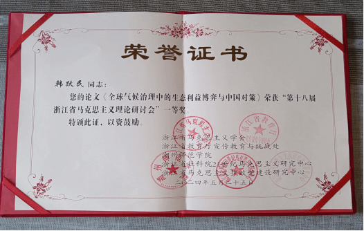 研讨会上,久久热 韩跃民老师撰写的《全球气候治理中的生态利益博弈与中国对策》荣获会议征文一等奖,张海波老师、孙武安老师撰写的《习近平生态文明思想蕴含的马克思主义立场观点方法》以及左雪松老师、黄佳佳研究生撰写的《新时代推进国家治理和参与全球治理的共进逻辑》分别荣获会议征文三等奖。