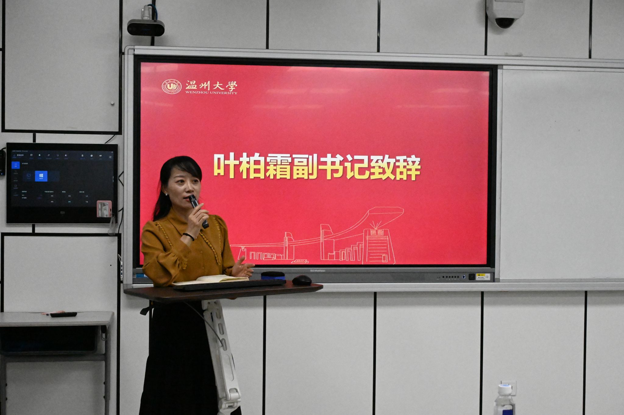 会议伊始,学院党委副书记叶柏霜老师致辞。叶书记在讲话中表达了学院领导和老师对于本次挑战杯比赛的重视,希望能够通过比赛助力搭建师生共创平台,期待这次的参赛选手能够赛出马院风采。