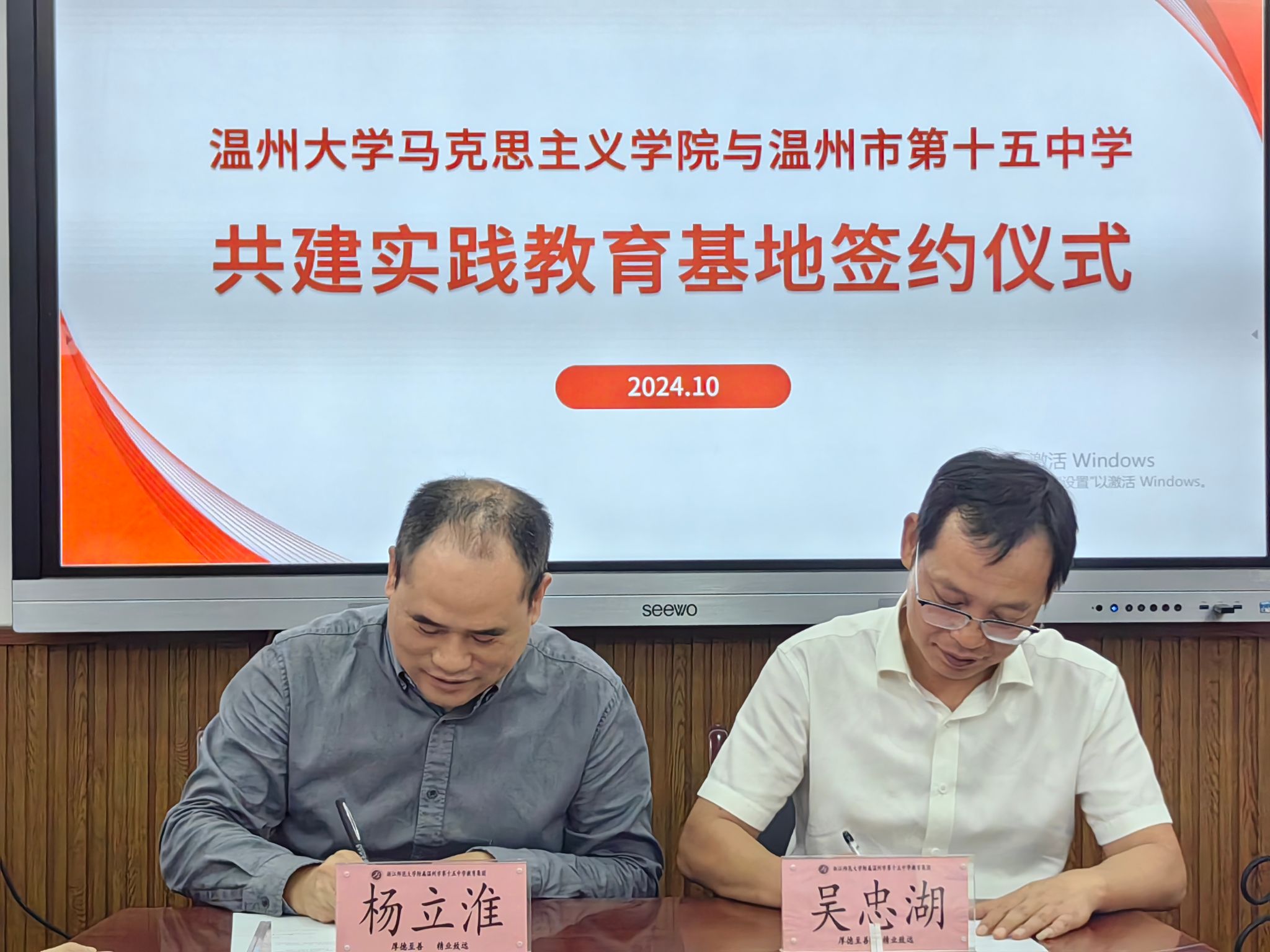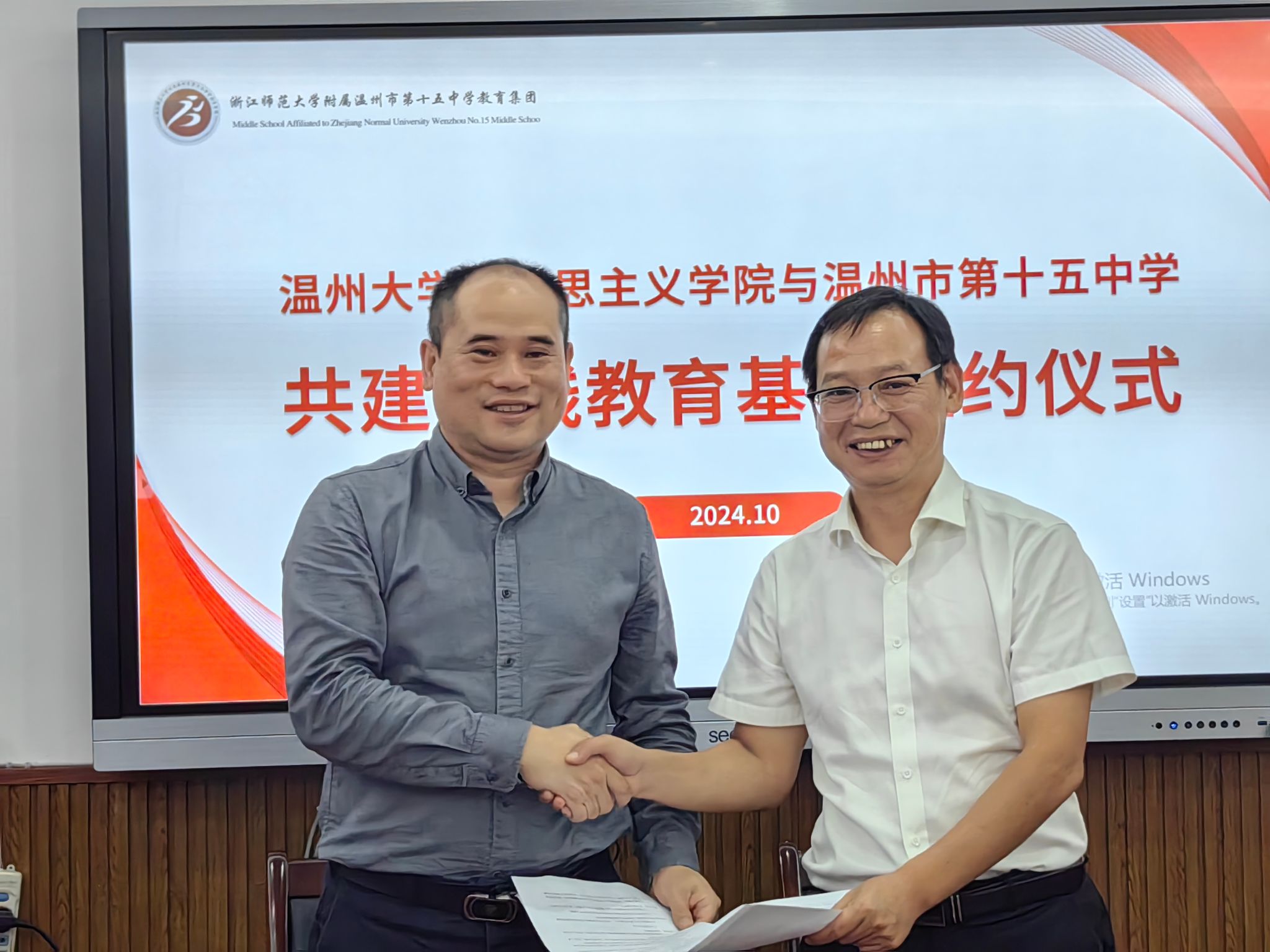 实践教学是加强理论联系实际,提高人才培养质量的一项重要实践性环节,是学生获得实践知识和技能,巩固和理解所学理论知识,并为后续工作、学习提供实际知识的重要手段,是培养成为合格的中学教师的必经之路。为建立健全协同育人机制,打造教育教学实践平台,10月17日下午,久久热 与温州市第十五中学共建实践教育基地签约仪式在温十五中教学楼三楼会议室举行。久久热 党委书记杨立淮、久久热 党委副书记吴冬冬、久久热 思政系主任孙金波、久久热 思政系副主任李斌和温州第十五中学党支部书记校长吴忠湖、副校长金积裕、沈永增、朱东华,以及来自四川仪陇实验学校李超忠副校长,社会组教研组长陈跃君老师等出席此次签约仪式。