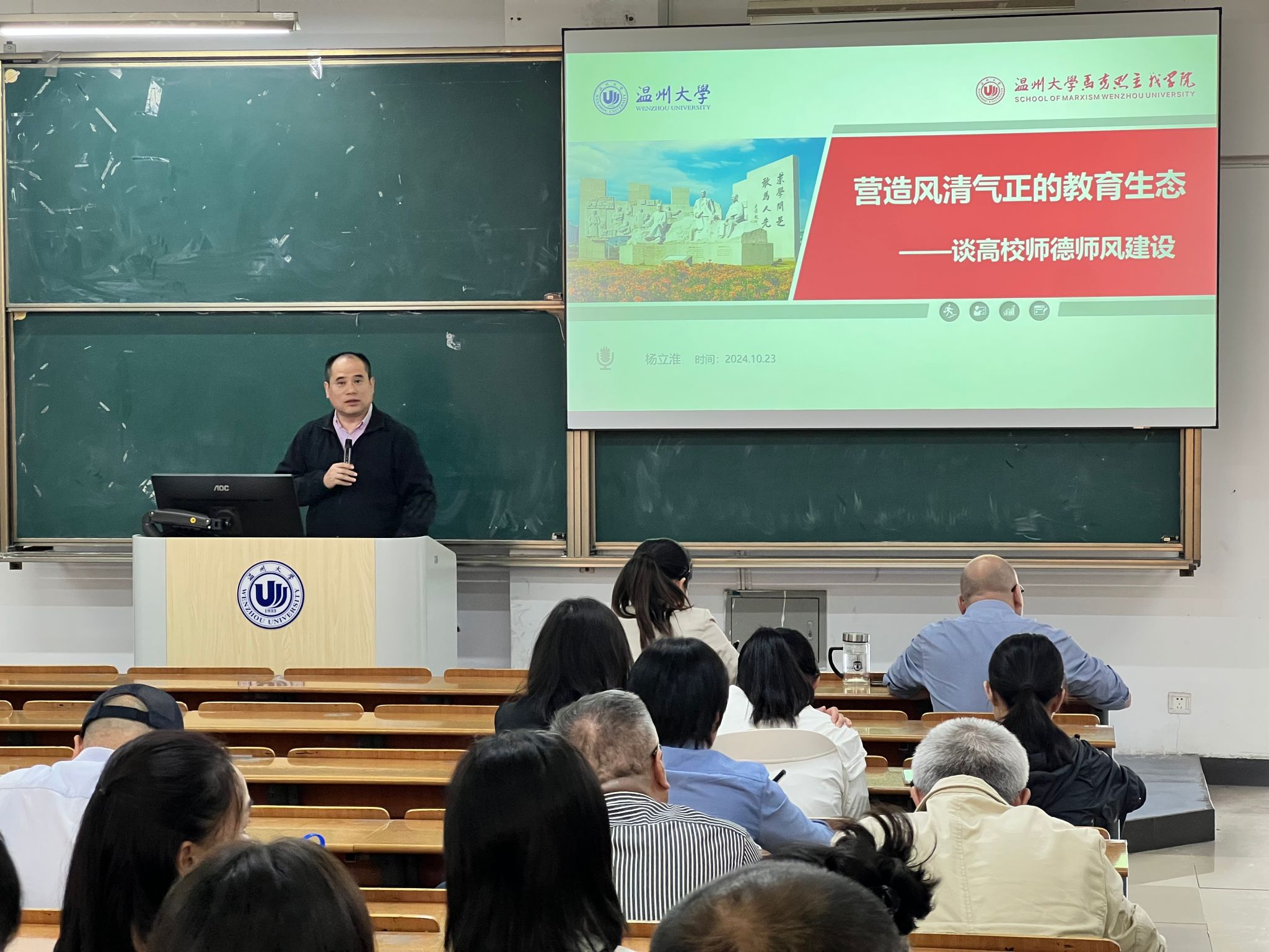 党委书记杨立淮以《营造风清气正的教育生态——谈高校师德师风建设》为题,为全体教职工讲述专题党课。课堂从全国教育大会引入,从学习习近平总书记关于教育的重要论述精神、从党和国家重视新时代教师队伍建设看师德师风、从高校师德失范案例中汲取经验与教训等3个方面,教育引导教师要落实立德树人根本任务,在提升教书育人的同时也要注重加强自身师德素养,坚决做到严守底线、不越“红线”。