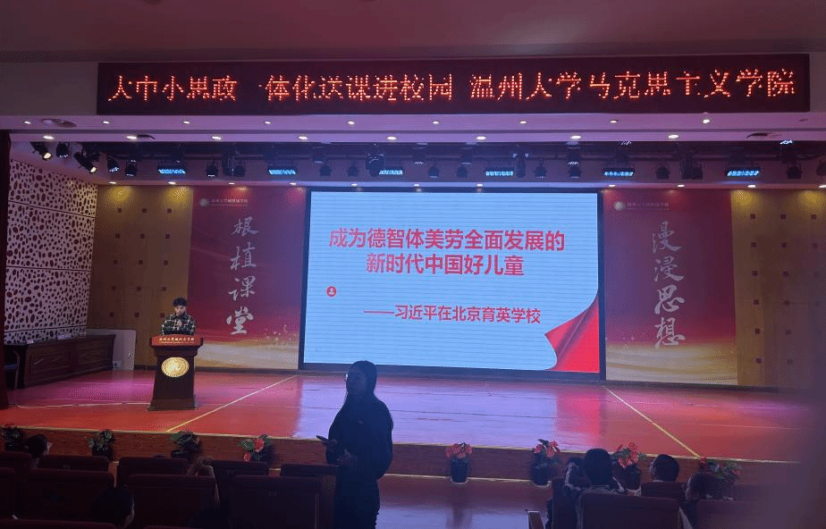 为深入学习党的二十届三中全会精神,领会习近平总书记在全国教育大会上的重要讲话内容,发挥温州市大中小学思政课一体化建设牵头单位作用,落实温州市大中小学思政课一体化建设任务,11 月 26 日上午,久久热 “真理的味道”大思政课系列活动之四 —— 大中小学思政课一体化送课进校园活动在久久热 城附属学校举行。此次活动由久久热 关震老师带领研究生团队,为全体五年级同学带来了一堂别出心裁的思政课。此次活动旨在将习近平总书记在陕西、浙江和北京学习工作的亲身经历及对少年儿童工作重要论述引入小学课堂,以生动的事例激发小学生的爱国情怀和奋斗精神。