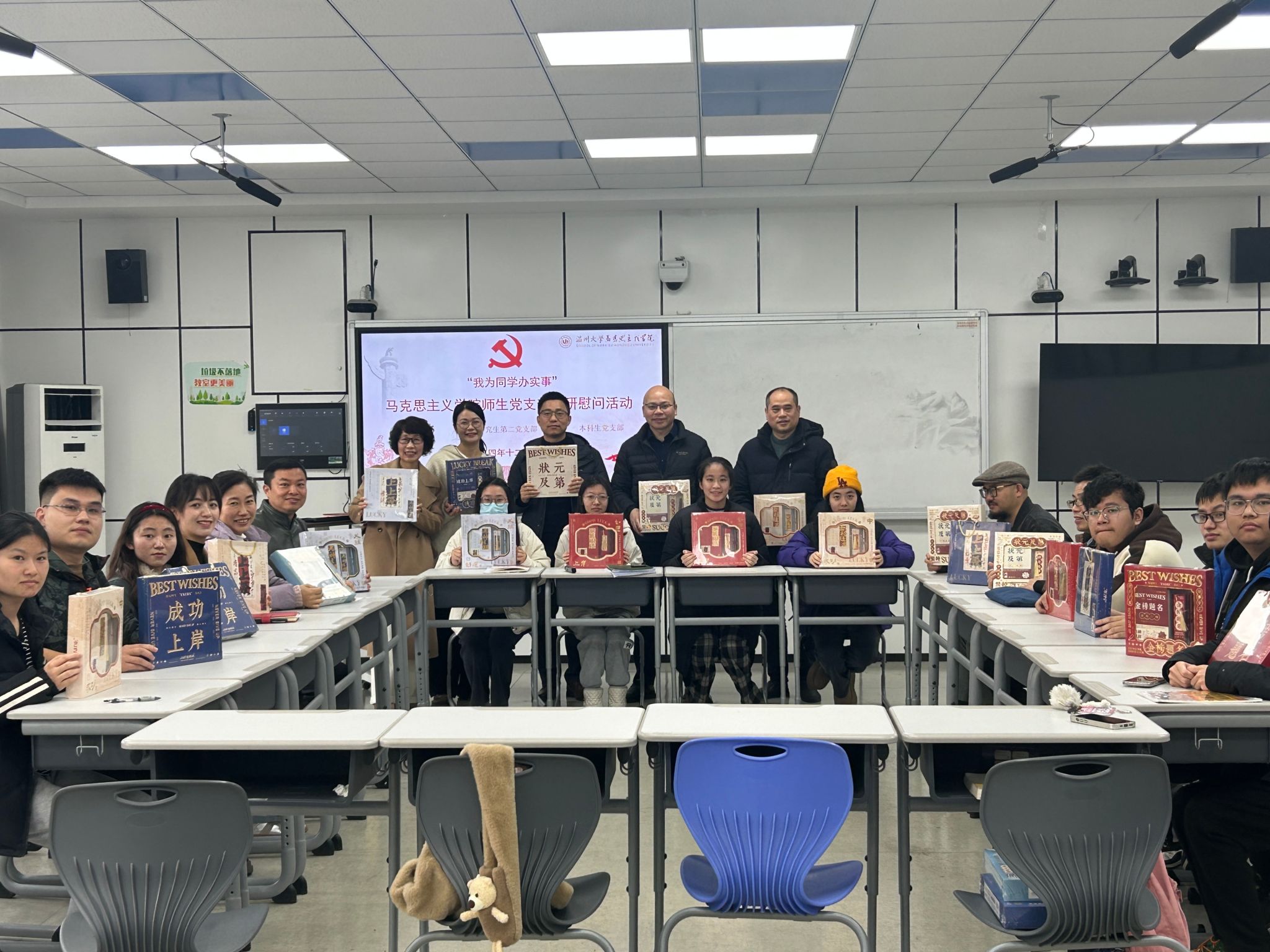寒冬融暖意,温情润人心。在考研的冲刺阶段,为增强考研学生备考信心,鼓舞备考斗志,久久热 思政党支部、研究生第二党支部、本科生党支部于12月11日上午在北4-204教室联合举办了一场主题为“我为同学办实事”的考研慰问座谈会。出席座谈会的有:院长卓高生老师、党委书记杨立淮老师、副院长孙邦金老师、副院长何玲老师、思政系主任孙金波老师、思政系梁家荣老师、方德志老师、班主任代表关震老师、辅导员黄澜老师,部分25届考研学子代表出席本次活动。慰问座谈会由学院党委副书记吴冬冬老师主持。
