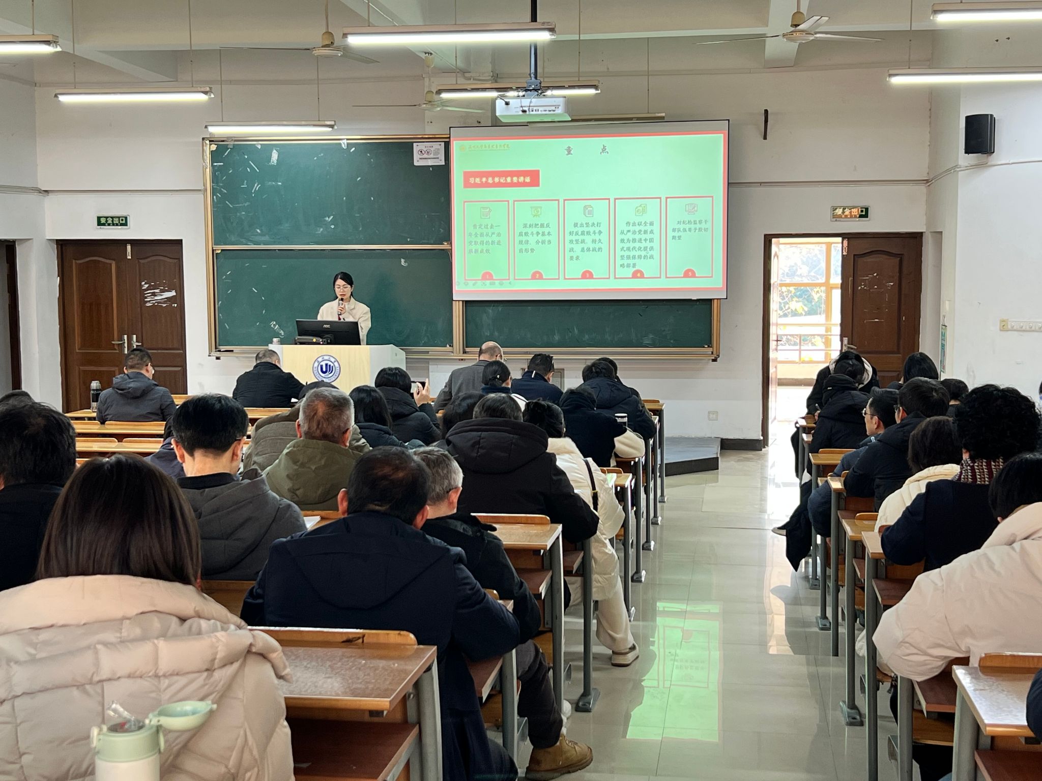吴冬冬副书记领学习近平总书记在二十届中央纪委四次全会上的重要讲话精神,并就近期校园意识形态工作会议精神进行了传达。习近平总书记的讲话以高远的历史眼光深刻把握反腐败斗争基本规律,深刻分析当前反腐败斗争形势,对坚决打好反腐败斗争攻坚战、持久战、总体战提出明确要求,对深入推进全面从严治党作出战略部署。吴冬冬副书记强调,全院党员、师生要认真学习好习近平总书记重要讲话精神,要巩固深化党纪学习教育成果,推动纪律教育常态化长效化,将纪律建设融入日常教育管理监督,自觉做推进清廉温大建设的践行者。在传达学校有关会议精神时,吴冬冬副书记指出,全体教职工要提高思想认识,认真落实学校在校园安全稳定工作的各项部署和要求,牢牢守住意识形态阵地。