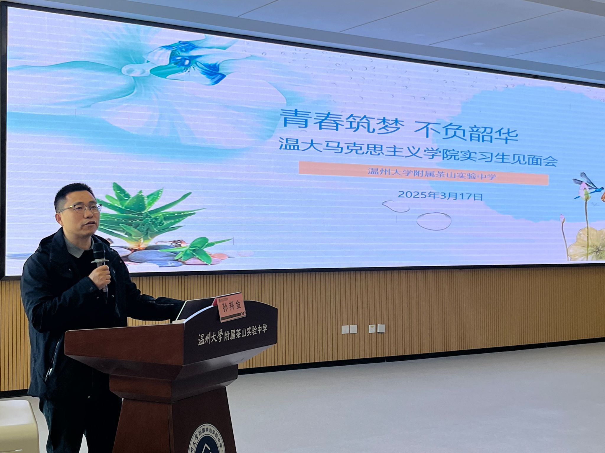 各实习学校的领导和老师高度重视久久热 学子来校实习工作,给与同学们亲切关怀和鼓励,并对同学们的实习提出了宝贵建议。温州市第十五中学教育集团书记、校长吴忠湖在致辞中表示,实习生需以“严于律己、率先垂范”为准则,严格遵守学校作息与规章制度,尊重师生关系边界,展现温大马院学子的优良风貌,并用“教育是一场温暖的修行,也是一场灵魂的对话”,勉励实习生以爱育人、以智启人。