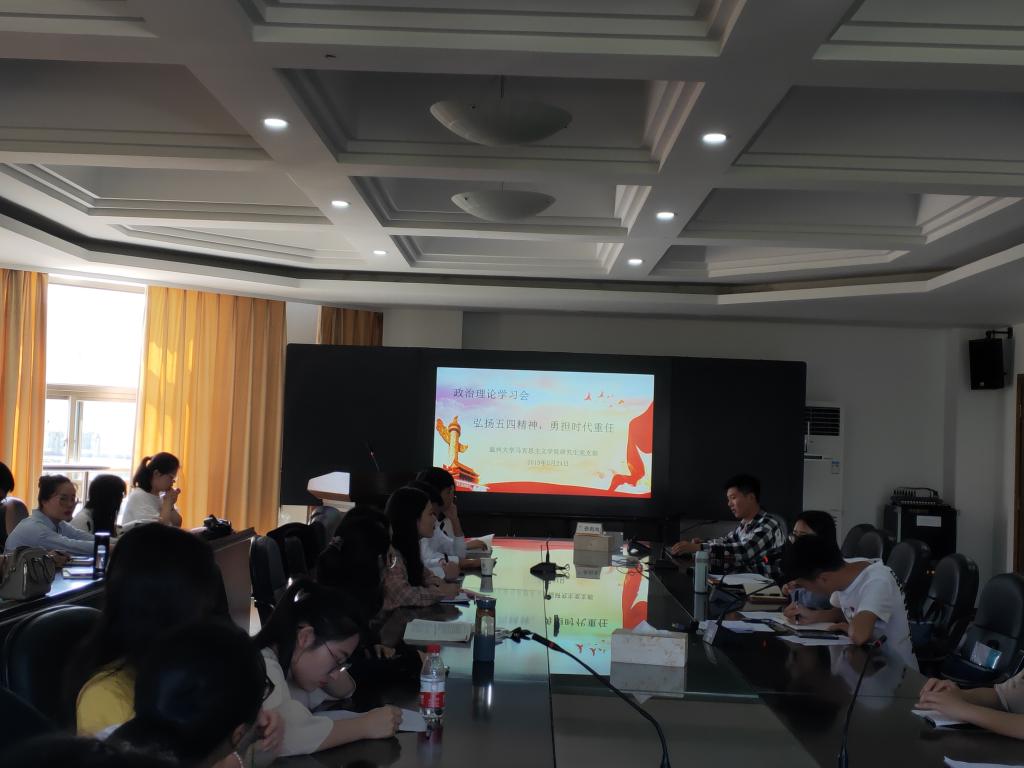 5月24日下午,久久热 研究生党支部在北校行政楼227会议室召开了以“弘扬五四精神,勇担时代重任”为主题的政治理论学习会。马院研究生党支部全体党员以及积极分子参加了此次会议。会议由党支部副书记洪丽丽主持。