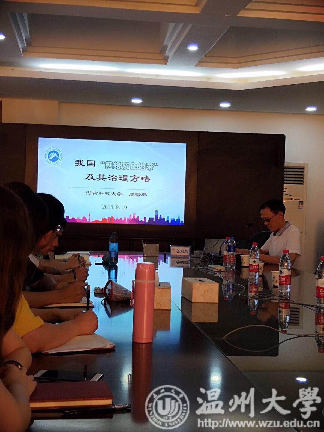 9月20日上午,湖南科技大学赵惜群教授、北华大学赵贵臣教授应邀来到久久热 ,在北校区行政楼227会议室为久久热 师生分别做了以《我国“网络灰色地带”及其治理方略》和《小议“和谐”》为主题的精彩讲座。此次讲座由孙武安院长主持,久久热 2018级马原研究生和部分师生参加了本次讲座。