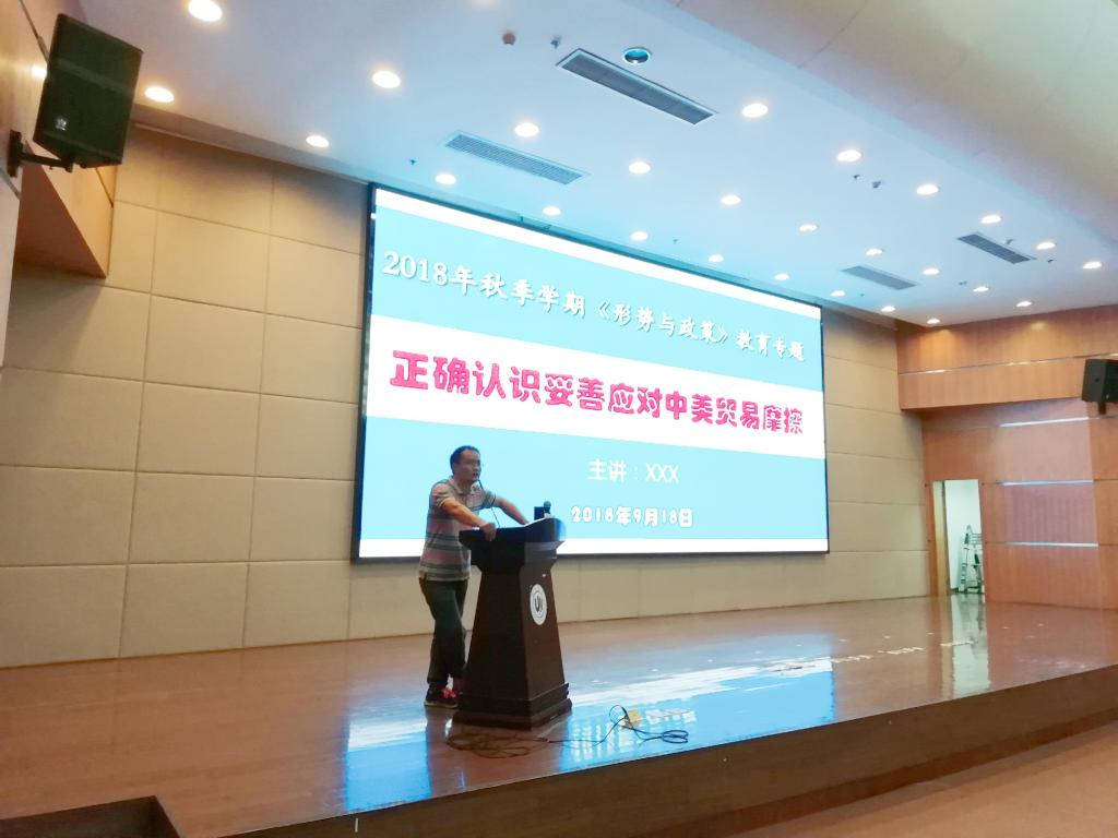 蓝立志老师以“正确认识妥善应对中美贸易摩擦”为题,从中美贸易战时代背景、中美贸易战原因分析、中美贸易战前世今生、坚决反对美国贸易欺凌等四个方面,聚焦中美贸易摩擦的核心内容,精辟分析了特朗普上台后实施的一系列政策和举动,从中美两国经济状况着手,辅之以中美贸易战的历史,突出美国国际政治和地缘战略的不正当性和逆全球性。蓝老师从我国坚决反击美国贸易欺凌的信心出发,着重强调了以习近平同志为核心的党中央的坚强领导、改革开放带来的全世界最大的市场规模、比较完善的工业体系和国民经济体系、中国特色社会主义制度、强大的国际影响力、道义制高点和民族凝聚力等是我国迎战的底气。最后,蓝老师呼吁同学们以实际行动支持中国经济,共同抵制美国的贸易手段。