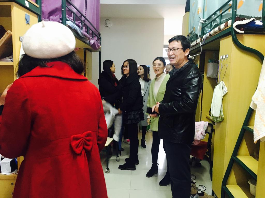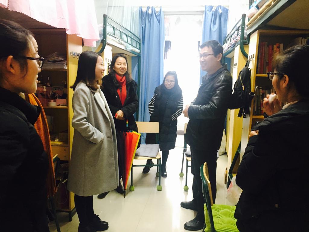 12月28日中午,久久热 总党支书记王柏民老师在教务科副科长童帆老师、综合科黄笑笑老师以及部分研会学生干部陪同下走进部分研究生寝室,对寝室用电安全、寝室财产安全等情况进行抽查,并了解学生的生活、学习情况。