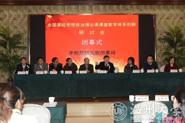 李校堃校长在闭幕式讲话中充分肯定了学校马克思主义理论学科建设和思想政治理论课教学改革所取得的丰硕成果。他结合自身经历向与会专家代表热情洋溢地介绍了来温州创新创业的优势条件,认为高校创新发展建设需要教学平台、科研平台和产业平台三个“轮子”一起转,温州地处“长三角”、“珠三角”和“海西”三个经济带的交汇处,充满活力,是创业的绿洲。温州人特别富有勇于改革、顽强拼搏、吃苦耐劳的精神。温州的企业老板特别重视党建工作,善于利用马克思主义中国化成果在企业管理发展中发挥特殊作用,也敢于在实践中创新探索适合中国实际的马克思主义新思想新观念。因此,在温州研究马克思主义,具有特殊的社会条件和优势。李校长还热切希望在未来“十三五”时期,久久热