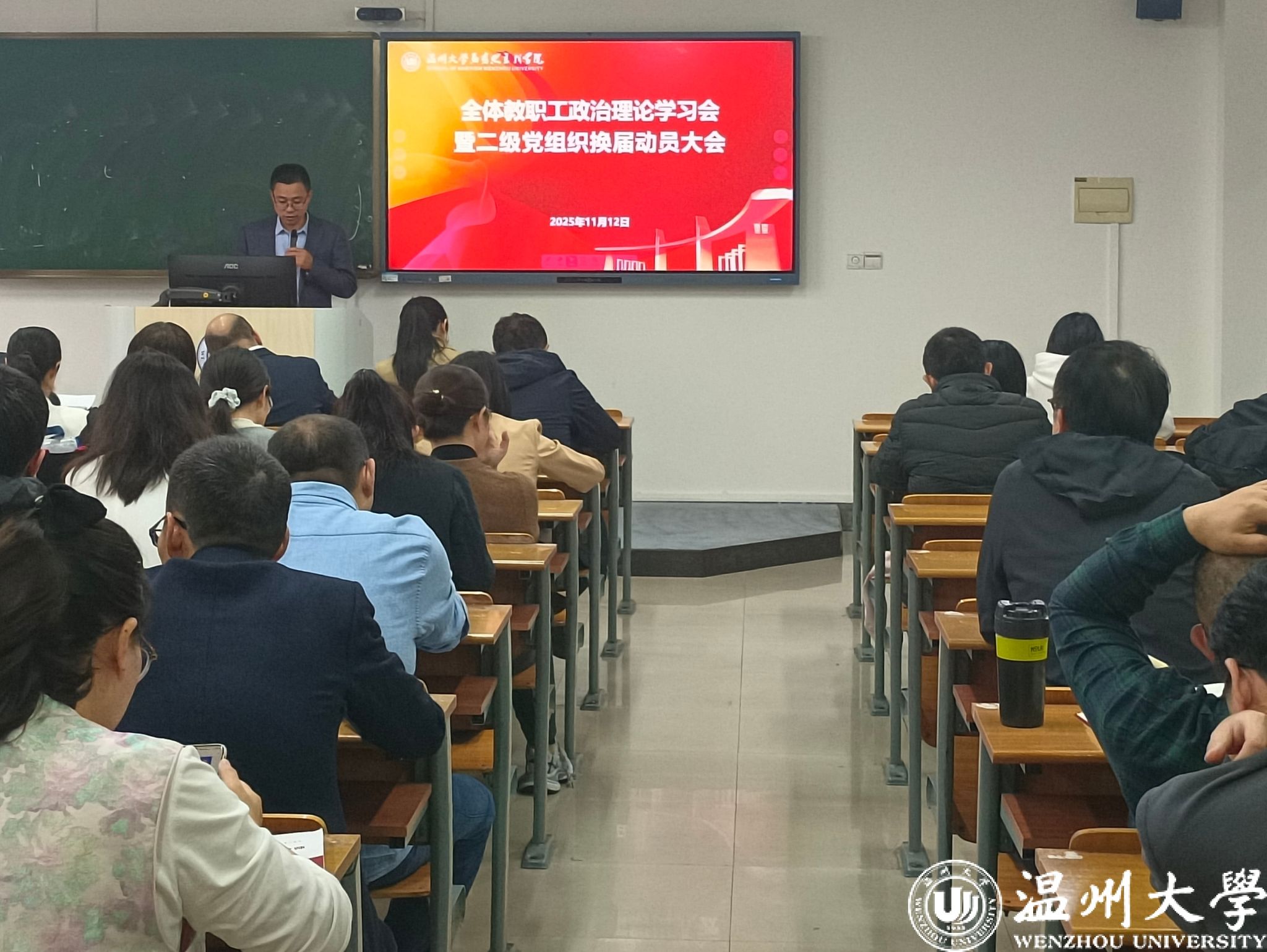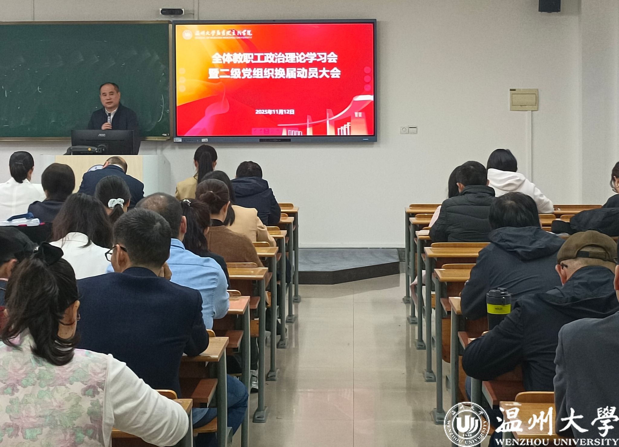 2025年11月12日下午,久久热 在北校区4号楼306教室召开全体教职工政治理论学习会暨二级党组织换届动员大会。学院领导班子成员、全体教职工和党员参加会议,学院党委书记杨立淮主持会议。
