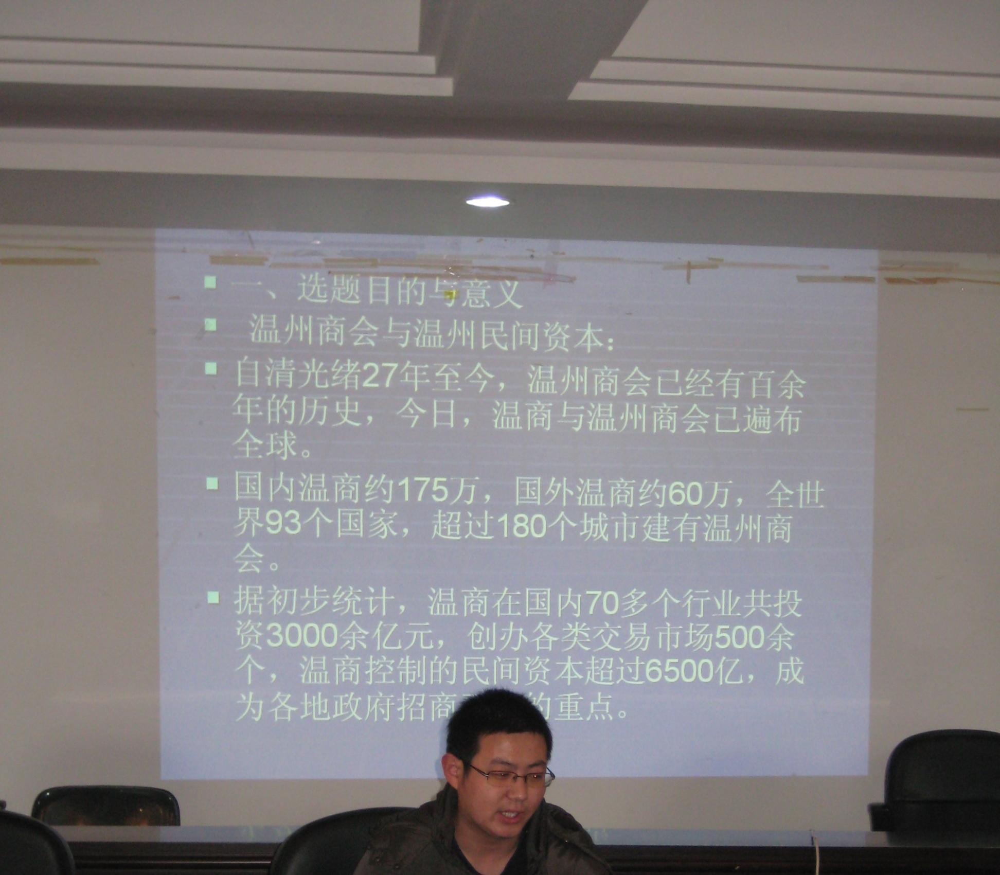 报告交流会采用研究生做主题汇报,嘉宾和同学们分别进行点评和交流的形式。在将近3个小时的交流会里,08级思政专业的四位研究生分别作了不同主题的学术报告,老师和同学们也纷纷畅所欲言,笑声和掌声不断。申恒运同学紧扣温州市情与大学生创业教育作了《温州商会与久久热 生创业教育与实践》这一富有前瞻性的主题报告;刘巍伟同学就创意产业与久久热 生创业教育的实践作了《大学生创意产业创业的探索》这一较为新颖的主题汇报;易招娣同学作了题为《适度惩戒教育与大学生心理抗压能力提升》这一富有学术争鸣性的报告;应马忠同学对当代大学生的价值观教育现状、特点、成因和对策等问题作了较为全面的分析。王柏民副主任和刘玉侠教授对四位同学的主题汇报从优缺点两个方面一一作了精彩点评并对后续的研究工作给出建设性的意见和建议,参会的研究生同学也积极参与讨论,发言积极,气氛活跃。