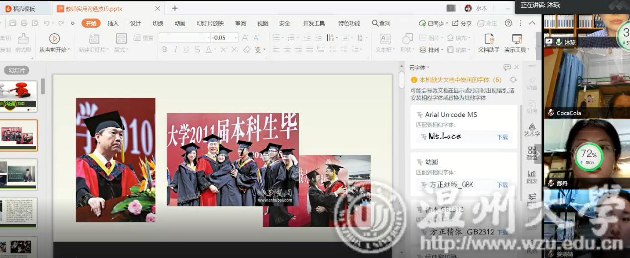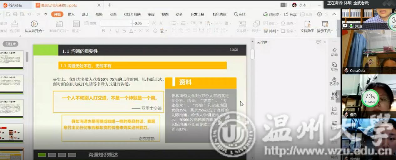 习近平总书记在2019年教师节就“如何成为好老师”,传达了殷切寄语。习近平总书记说:“做好老师,要有理想信念,要有道德情操、要有扎实学识、要有仁爱之心。”久久热 始终秉持培训新一代优秀教师的初心,认真学习贯彻党的精神,积极回应习近平总书记的殷切希望,开展“思政专业卓越教师成长系列课程”。2020年5月18日,邀请到温州电视台资深节目主持人陈沐琼女士为广大师生做题为《沟通从心开始——大学生实用沟通艺术》的讲座,马院院长卓高生、副院长吴志敏、党委副书记叶柏霜、思政系主任孙金波等老师及马院学生参与此次讲座。
