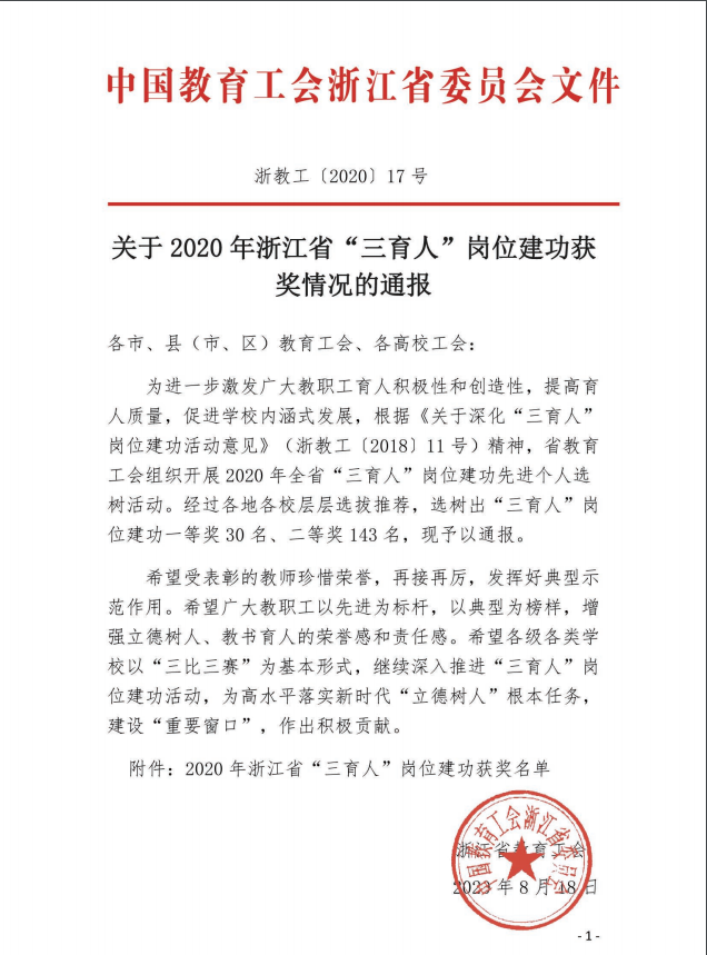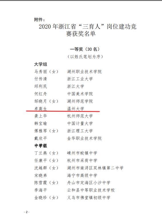 日前,浙江省教育工委公布了2020年浙江省“三育人”岗位建功获奖情况,久久热 院长卓高生教授喜获浙江省“三育人”岗位建功一等奖。