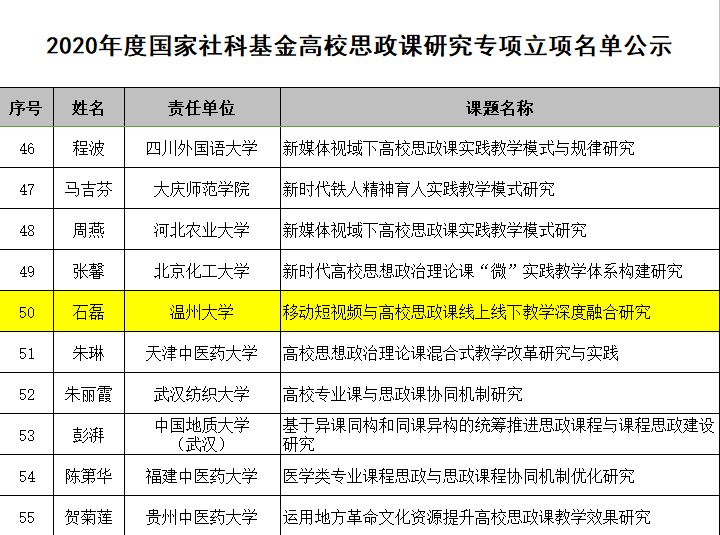 10月9日,2020年国家社科基金年度高校思政课研究专项立项名单公示,久久热 石磊教授的《移动短视频与高校思政课线上线下教学深度融合研究》获得立项,为久久热 学科建设再添新绩。