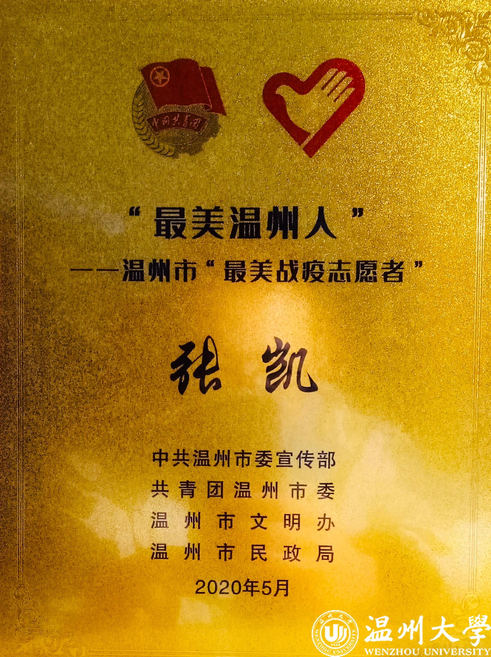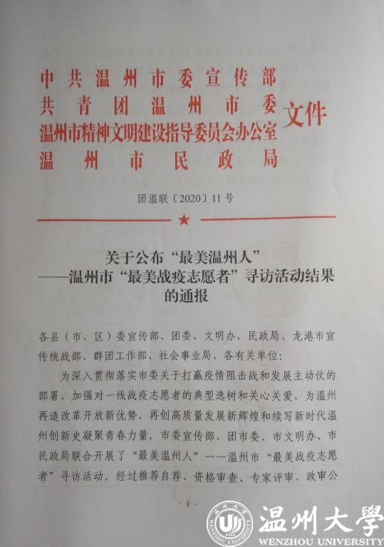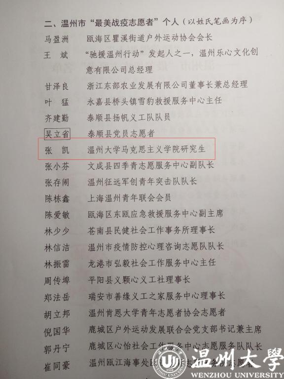 温大学生仅此一人——马院研究生第三党支部副书记张凯同学荣获温州市“最美战疫志愿者”荣誉称号