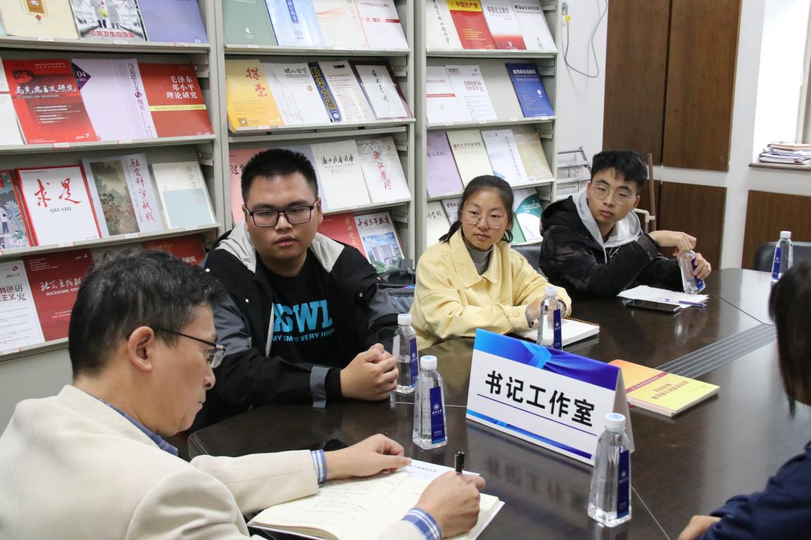 为进一步落实党史学习教育中“我为群众办实事”的要求,加强学院领导与基层学生的交流联系、真正做到为学生服务,久久热 于2021年11月3日下午于行政楼222室举办了“实事求是,服务学生”——“书记工作室”新生代表座谈会。学院党委书记王柏民出席并主持本次会议,与21级本科生以及学专硕学生代表进行深入交流。