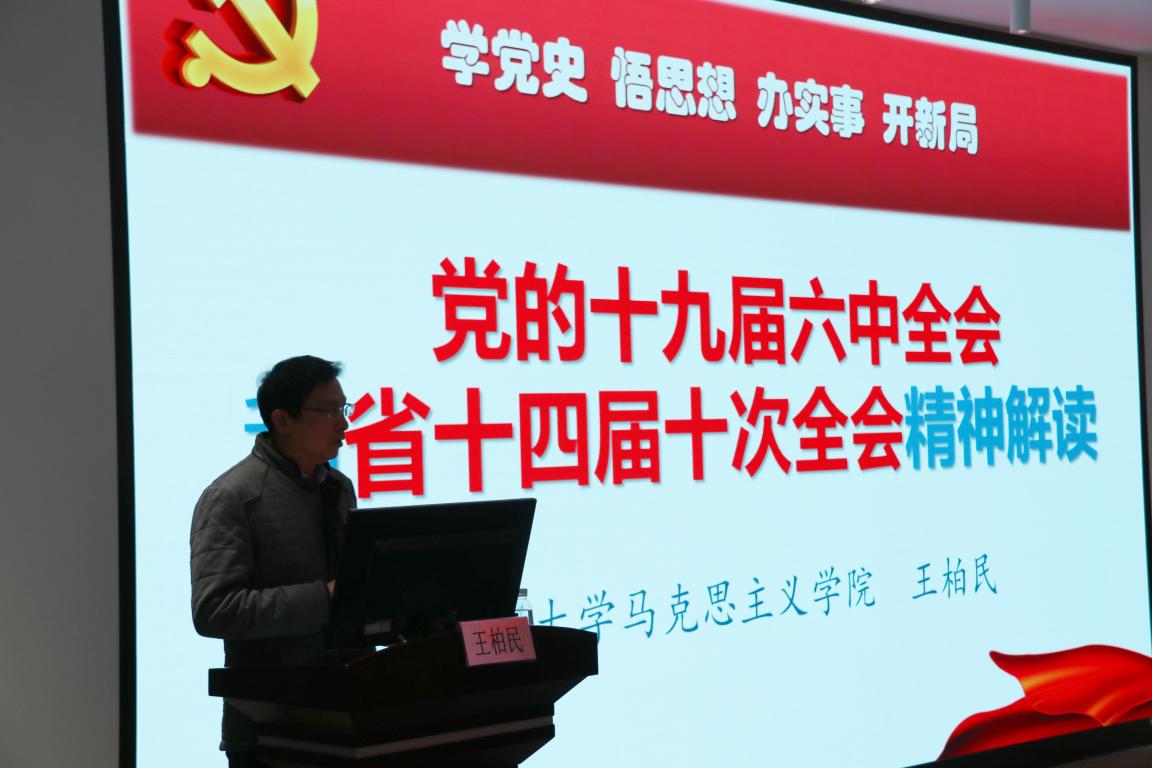 为更好推动全院学生学习贯彻党的十九届六中全会精神,深刻领会把握全会的重大意义,统一思想、凝聚共识、汲取力量,2021年12月8日晚,久久热 于久久热 马克思主义理论教育基地开展了学习党的十九届六中全会精神形势政策课。本次课程由久久热 党委书记王柏民主讲,以党的十九届六中全会为切入,用四个关键词分述课程。