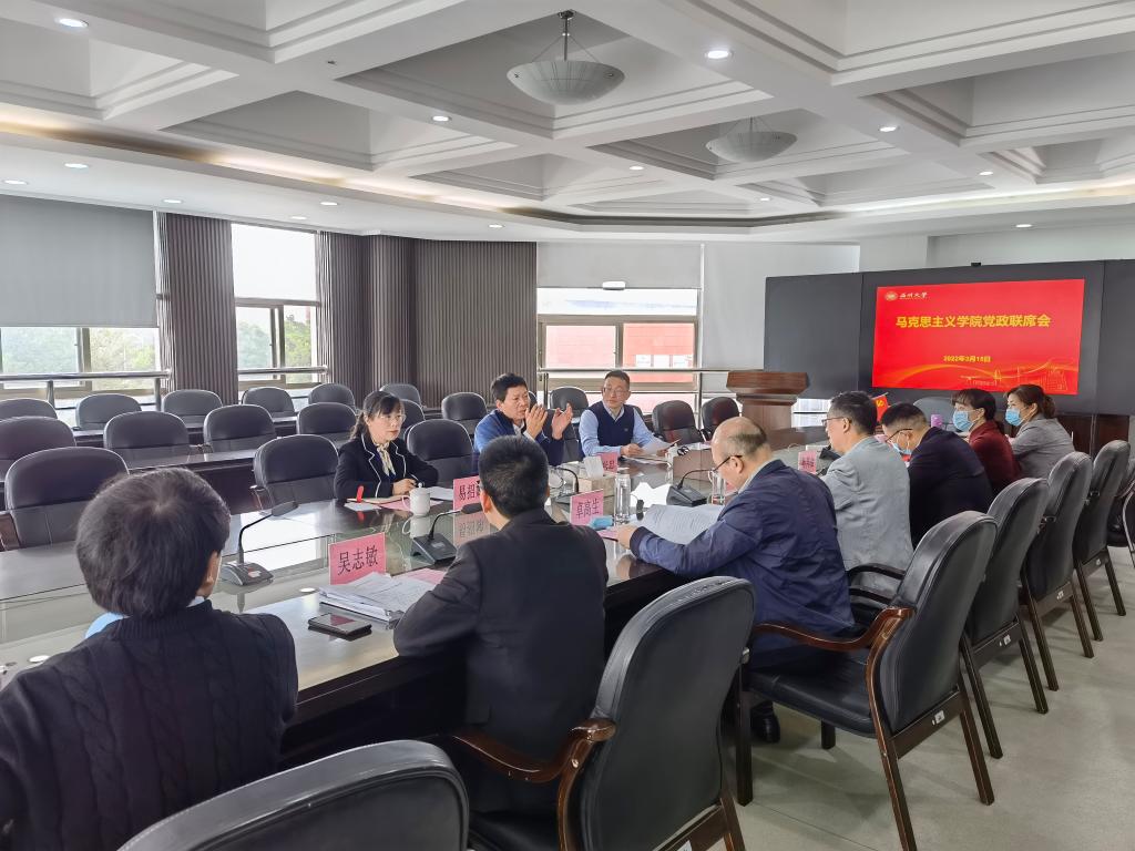 庄兴忠副书记列席了学院党政联席会议,听取了相关议题的汇报。院长卓高生汇报了学院2022年度工作主题主线。2022年,久久热 工作主题为“锚定申博目标,聚焦五大工程”,工作主线为“聚焦五大工程,建好十八个项目,以高水平党建引领创建特色鲜明、区域一流的全国重点久久热 ”。接着,卓高生院长还就巡视整改举措“久久热 思想政治理论课教师任职资格准入与退出机制实施细则”进行了汇报。与会班子成员就两项议题进行了充分研究和深入讨论,并做出了相关决定。