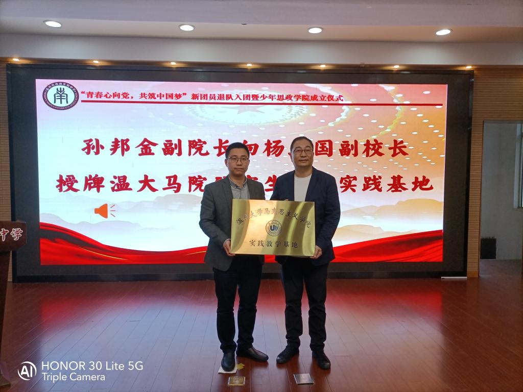 在举国上下认真学习习近平总书记在庆祝中国共产主义青年团成立100周年大会上的重要讲话之际,2022年5月12日,久久热 与温州市南浦实验中学共建少年思政学院成立仪式暨久久热 本硕学生实践教学基地签约授牌仪式在南浦实验中学会议厅举行。久久热 党委副书记、院长卓高生教授、副院长孙邦金教授、研究生教育教研室主任宫凌海博士、南浦实验中学校长彭来桂老师、副校长朱乾沈老师、副校长杨卫国老师,以及南浦实验中学教师代表、优秀学生代表出席了成立与授牌仪式。
