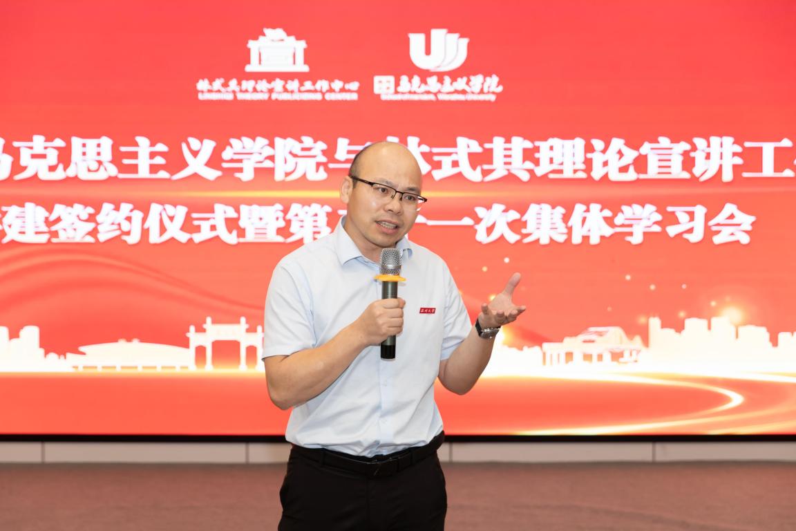 共建协议书签订之后,与会人员一起参加了中心举行第二十一次集体学习会。中心宣讲骨干杨胜作《台湾问题》宣讲。吴志敏副院长围绕《学习贯彻习近平总书记“7·26”重要讲话精神和〈习近平谈治国理政〉第四卷》作了主题宣讲。两位主讲人精彩的讲解阐释,为现场听众送上了丰盛的理论学习“大餐”。