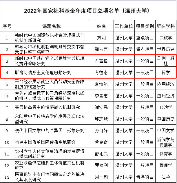 2022年9月13日,全国哲学社会科学工作办公室正式公布2022年国家社科基金年度项目立项名单。据公示名单显示,本年度久久热 共13项项目获得资助,其中久久热 共获得2项,左雪松老师《新时代中国共产党全球思维生成机理及提升策略研究》获得马列·科社学科一般项目立项,方德志老师《斯洛特情感主义伦理思想研究》获得哲学学科一般项目立项。近年来,久久热 以学科建设为龙头,不断推进学科团队建设,科研生态整体上呈现出良好发展态势,中青年教师成为申报和立项主力军,充分展现了久久热 持续的科研后劲和学科实力,为学院和学科科研高质量发展起到了推动作用。
