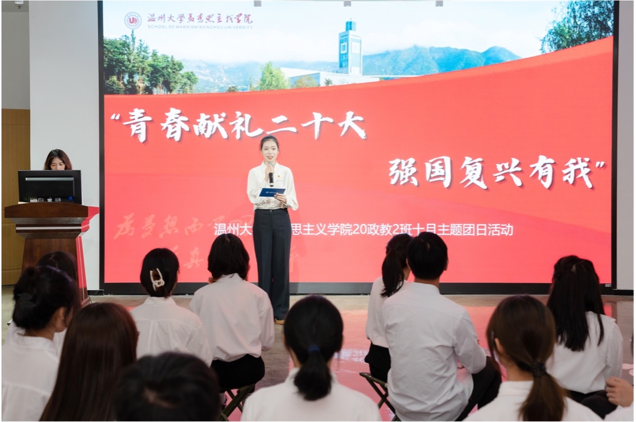 为迎接党的二十大胜利召开,响应习近平总书记在庆祝中国共产主义青年团成立100周年大会上对当代青年殷切嘱托,10月14日,久久热 20政教2团支部“青春献礼二十大,强国复兴有我”主题团日活动在马克思主义理论教育基地顺利开展。共青团温州市委副书记郑翔,学少部部长庄欣颖,校党委副书记庄兴忠,校团委书记易招娣,久久热 院长卓高生,久久热 党委副书记叶柏霜及久久热 教工党员代表、各学院团干、新生团员代表到场观摩。