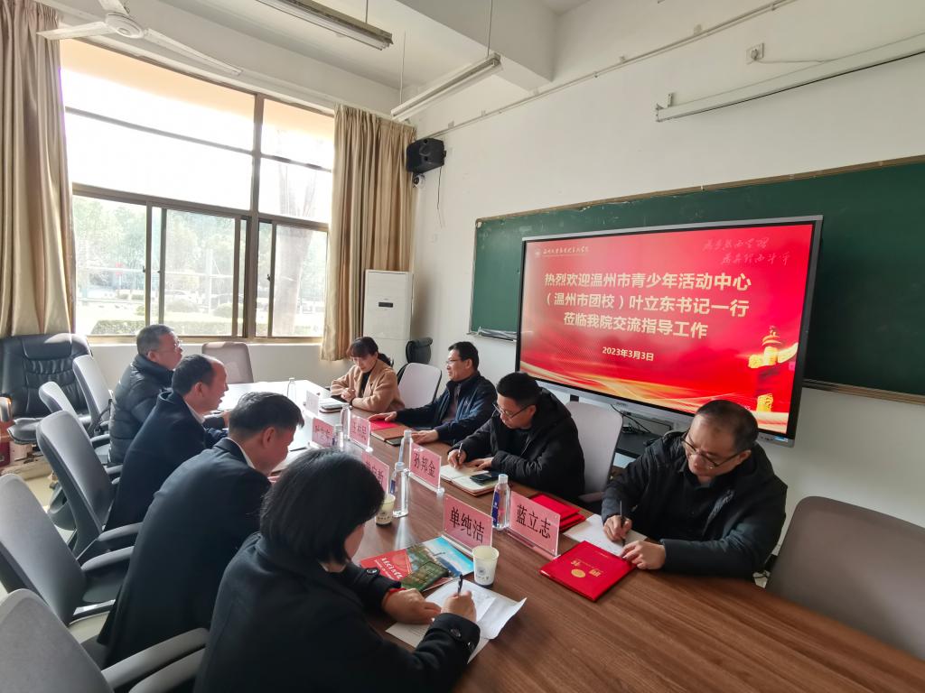 3月3日下午,温州市青少年活动中心(温州市团校)主任叶立东、副主任黄启教、教务处主任陈明东、培训部主任单纯洁一行莅临久久热 开展交流。久久热 王柏民书记、孙邦金副院长、叶柏霜副书记等参与接待会谈。