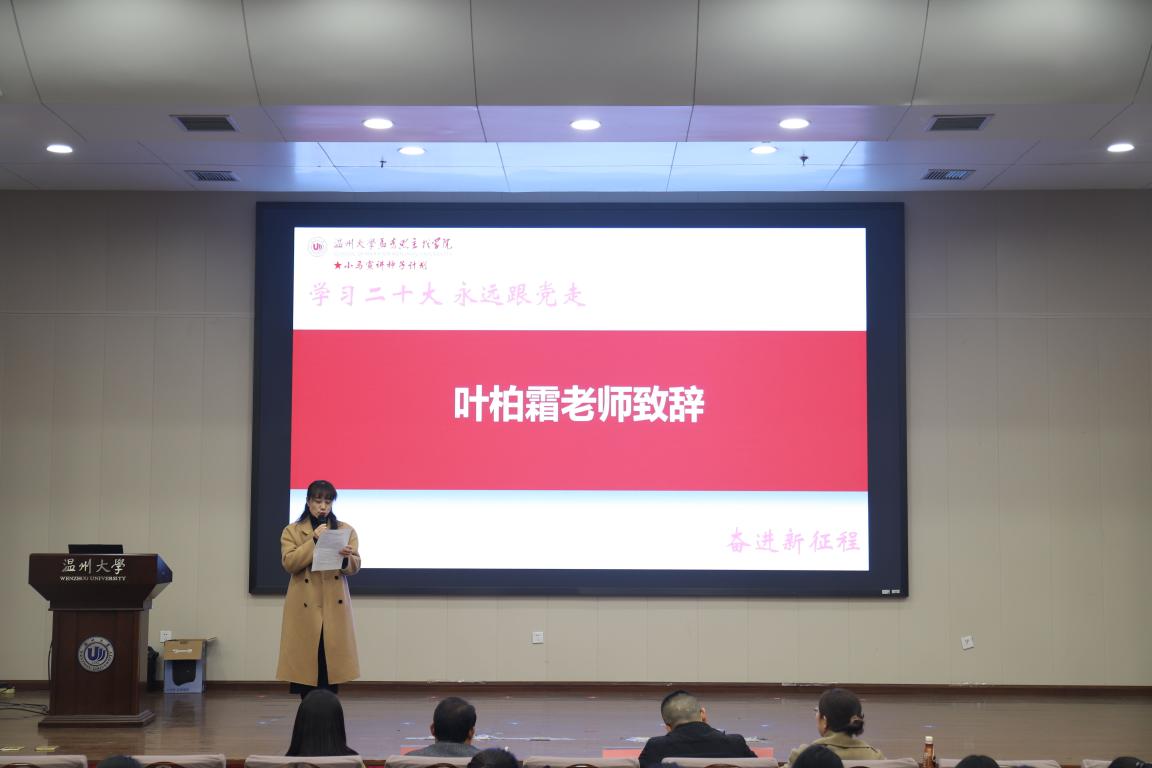 比赛伊始,学院党委副书记叶柏霜老师进行致辞,总结了久久热 在过去微课大赛中取得的优秀成绩,并对本次活动表达了殷切的期望,希望选手们在宣讲过程中能讲出三味:讲出马院味,讲好红色教育故事,传承红色精神;讲出时代味,讲好发展成就故事,突出鲜明时代特征;讲出青春味,讲好青春奉献故事,展现青春风采。
